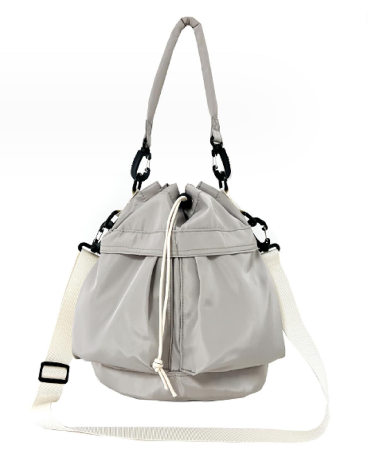 【巾着デザインで出し入れ簡単】 口元は巾着タイプで大きく開閉でき、荷物の出し入れがスムーズ。中身が見えにくく、防犯性もアップ。見た目も柔らかなシルエットで、コーディネートのポイントになります。