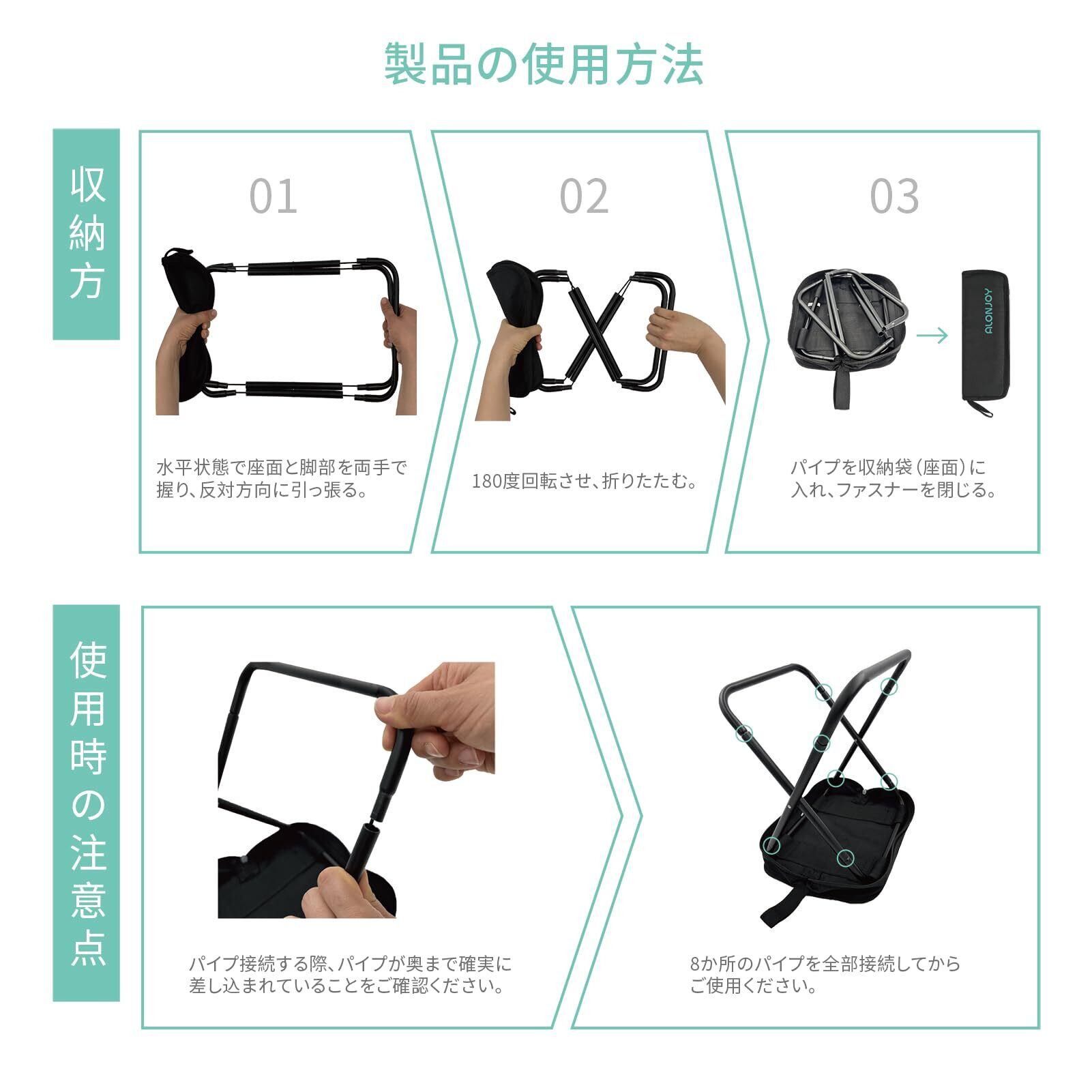 【高品質】 ①フレーム:アルミ合金のジュラルミン製頑丈さと安定性が優れる、耐荷重は100㎏まで!ただ、ストンと一気に座ると衝撃荷重が大きくなり、繋ぎ目が折れたりする原因にもなります。 ②座面:600Dのオックスフォード生地、破れにくい、通気性もあり。 裏側に補強帯付き、それにクッション材充填の2層構造で座り心地もより快適!