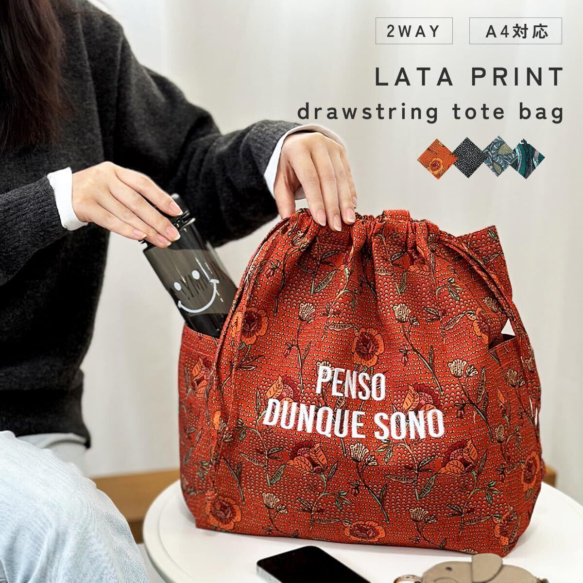 デザイン:総柄プリントデザインがエスニックでお洒落。ドローコードで巾着型に。A4、マチ広で大容量。二つのサイドポケット付きで折り畳み傘や500mlのペットボトルも収納可能◎