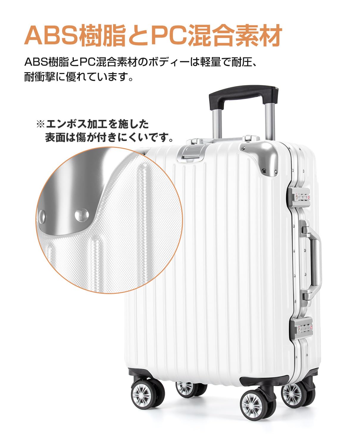 【改良されたアルミフレーム&ボディー素材】スーツケースは強化アルミフレームを採用し、従来のファスナータイプに比べ、高級感があって頑丈です。また、スーツケース本体の形状維持を強化させ、耐衝撃性と耐久性を向上させます。ボディーはABS樹脂とPCの混合素材で作られ、耐衝撃性に優れています。エンボス加工を施し、傷つきにくいです。