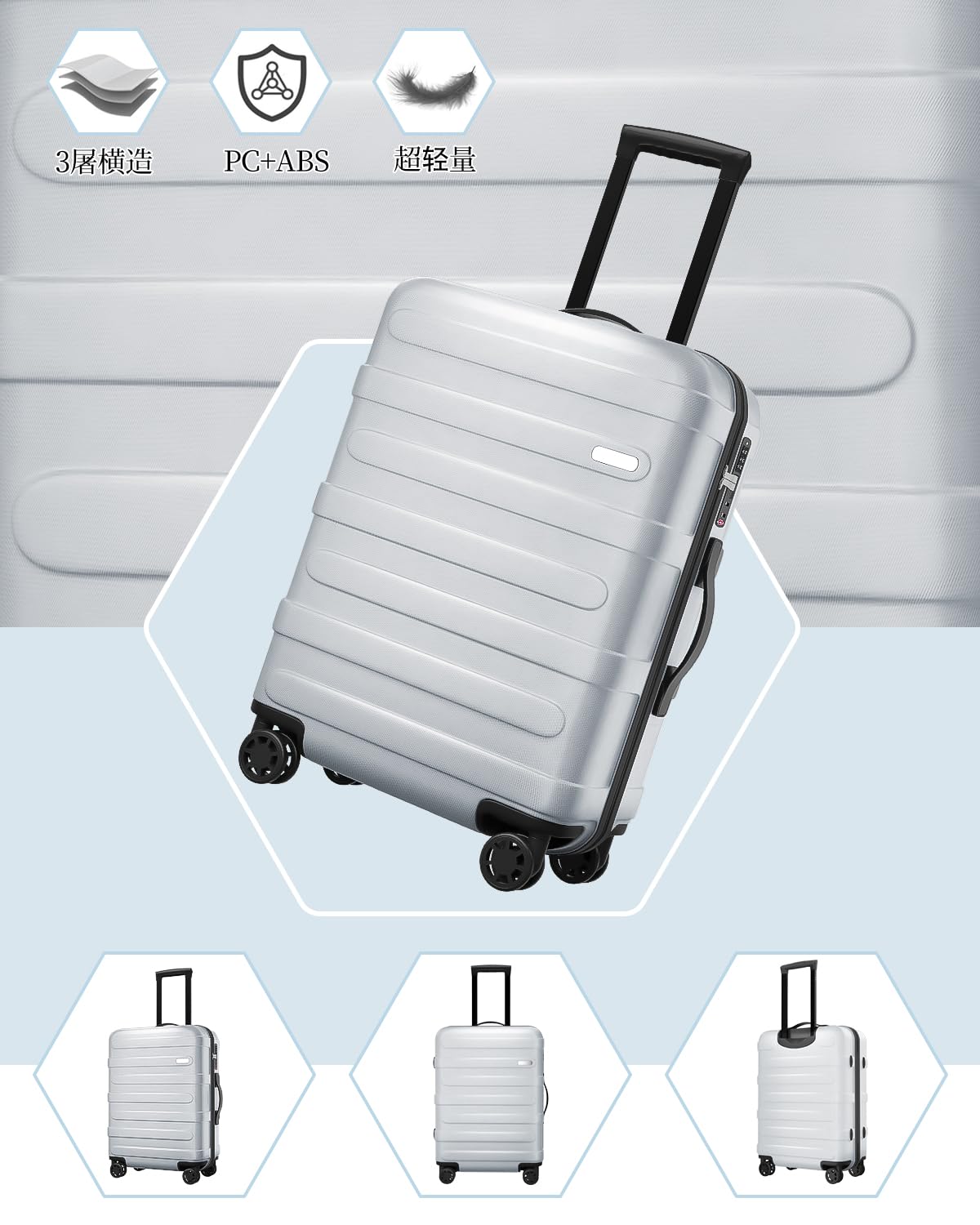【超軽量で耐圧力がいい】 人気のABS樹脂+PC(ポリカーボネート)樹脂を採用しており、耐衝撃性や丈夫さなどの各方面の機能性がアップしています。PC素材の耐圧縮性、弾力性に優れており、スーツケースは高いところから落ちるても、重いもので押せられても、元の状態を維持することができます。横縞デザインにより、傷を防ぐことができます。超軽量ですから海内外のトラベルやビジネス出張に便利です。