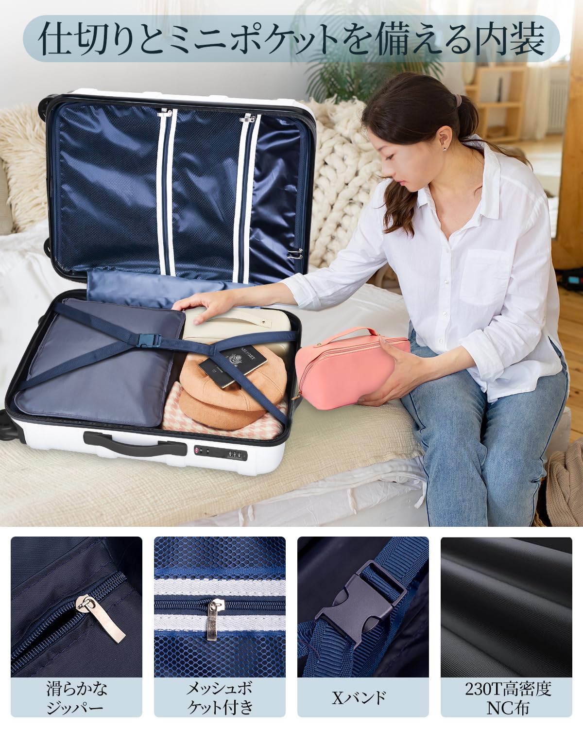 【耐衝撃静音ダブルキャスター】高弾性TPE衝撃軽減素材のキャスターを採用し、安定感のある8輪キャスターは高弾性TPE衝撃軽減素材のキャスターを採用し、360°回転で方向転換もラクラク。横にピタッと付けて歩いても、引っ張って歩いてもスムーズに移動できます。キャスター部に特殊な材質を採用しアスファルト上でも回転摩擦音を低減しました。また、X型ベルトが搭載され、荷物崩れを防着ます。