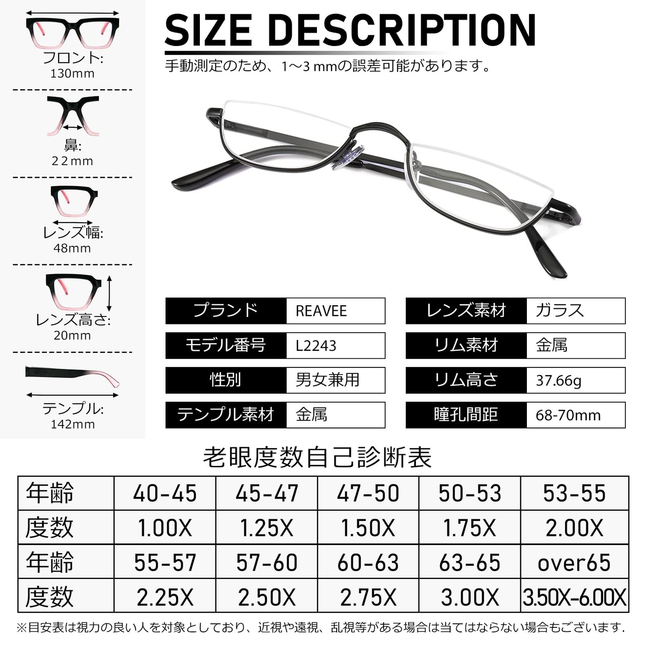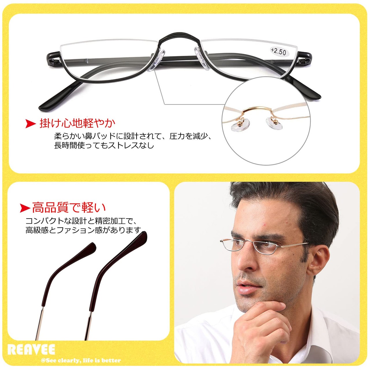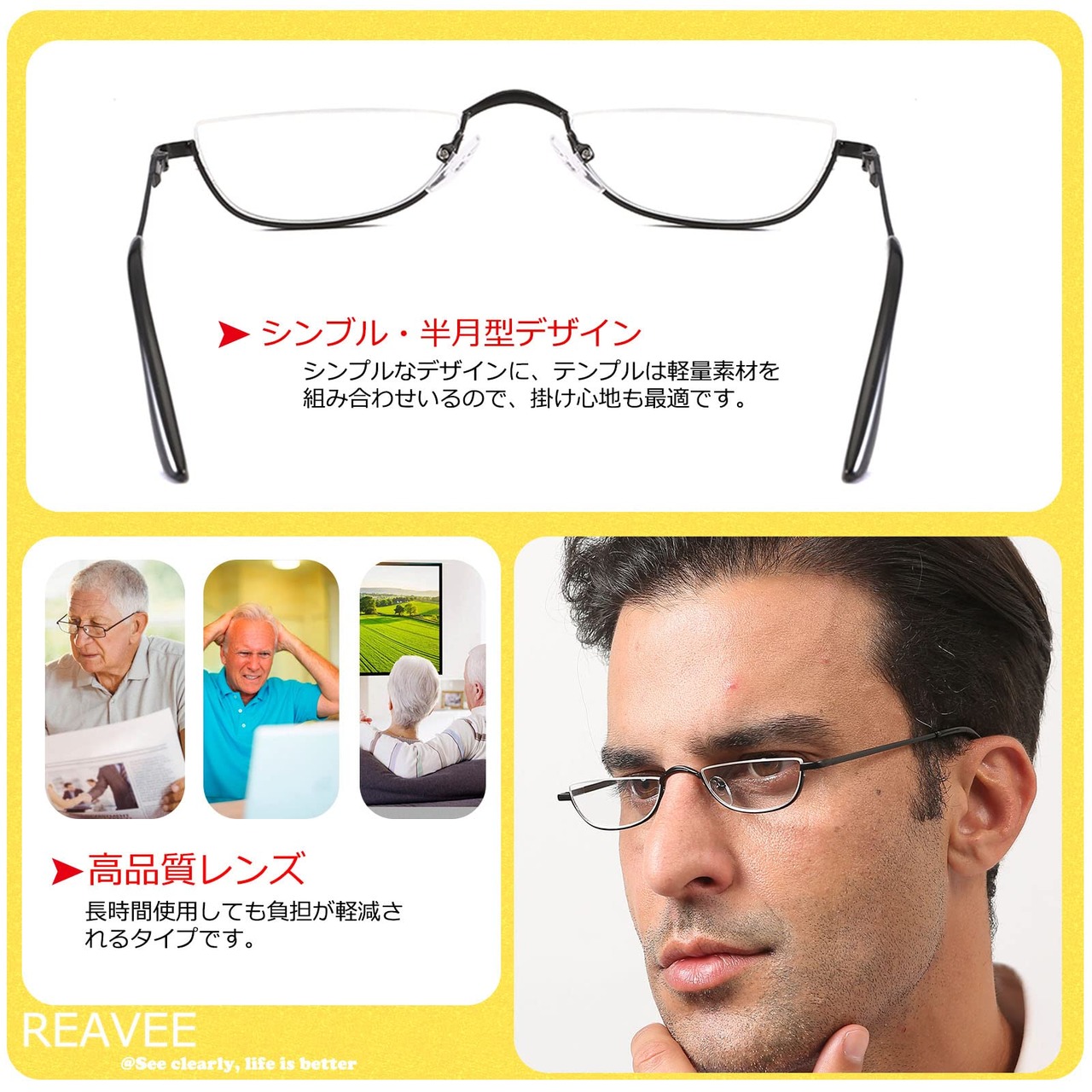 [REAVEE] 老眼鏡 ハーフフレーム 半月型 メタル 薄型 軽量 男女兼用 おしゃれ ケース付き 度数 「+1.0~+3.5」