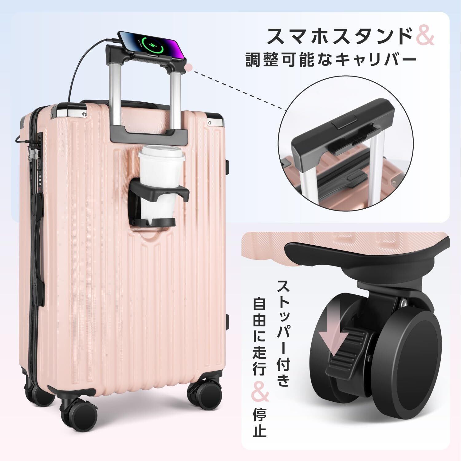 [JOLISTAR] スーツケース キャリーケース キャリーバッグ 機内持込 ABS+PC 耐衝撃 大容量 大型 超軽量 静音 ブレーキ機能 ダブルキャスター Type-C&USBポート カップホルダー 隠しフック 360度回転 ストッパー付き ファスナータイプ スマホスタンド おしゃれ 旅行 ビジネス 出張 修学 泊まる 入院