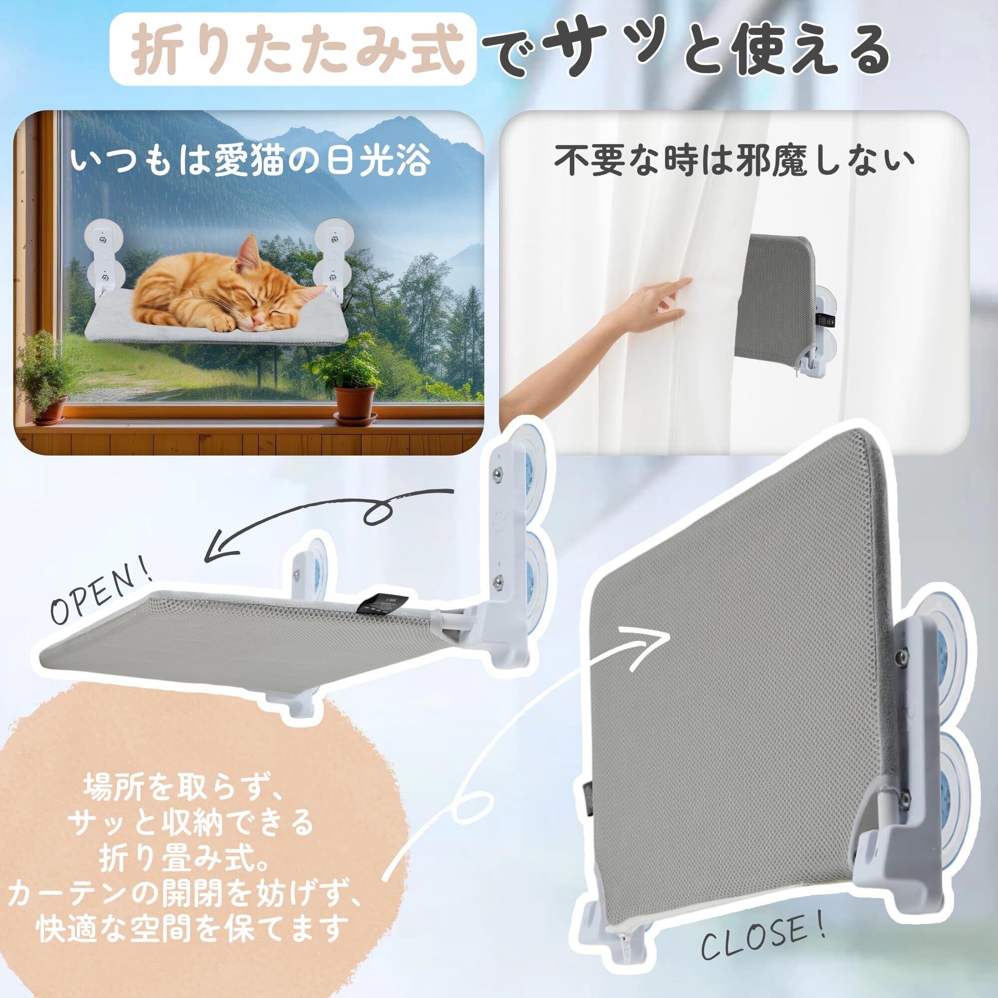 【省スペースで使いやすいデザイン】 使用しないときは簡単に折り畳み可能で、収納やカーテンの開閉を邪魔しません。キャッ トタワーやキャットウォークよりも場所を取らず、省スペースで設置できるのも魅力です。
