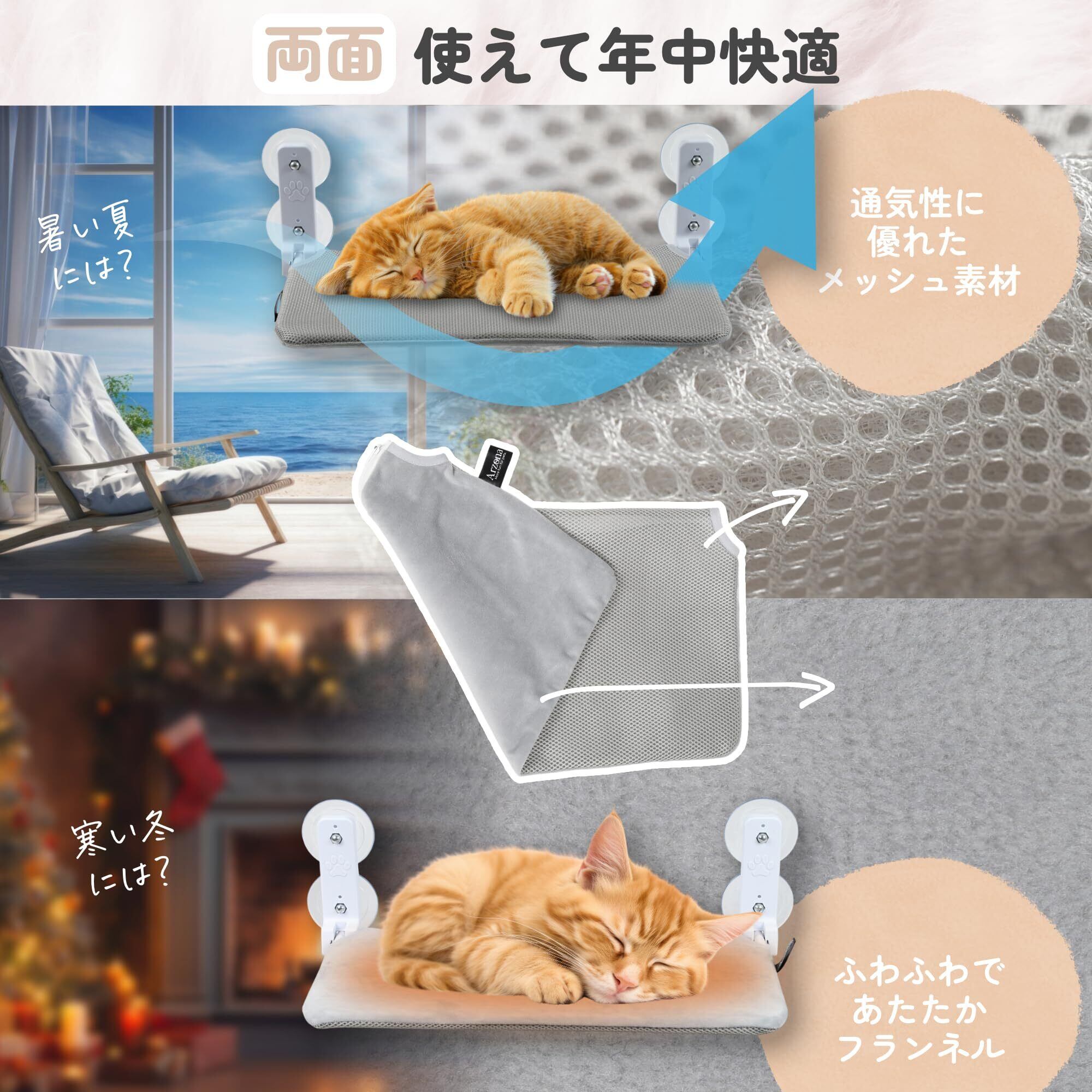 【広々としたスペースと耐荷重】 Arzonaの窓用ハンモックは、サイズが52cm × 30cm × 20cmで、耐荷重は30kgまで対 応しています。2匹の猫ちゃんでも安心して利用でき、丈夫な設計です。吸盤4個でしっか り固定されるので、安定感と耐久性も抜群です。速乾性があるため、通年おすすめで す。