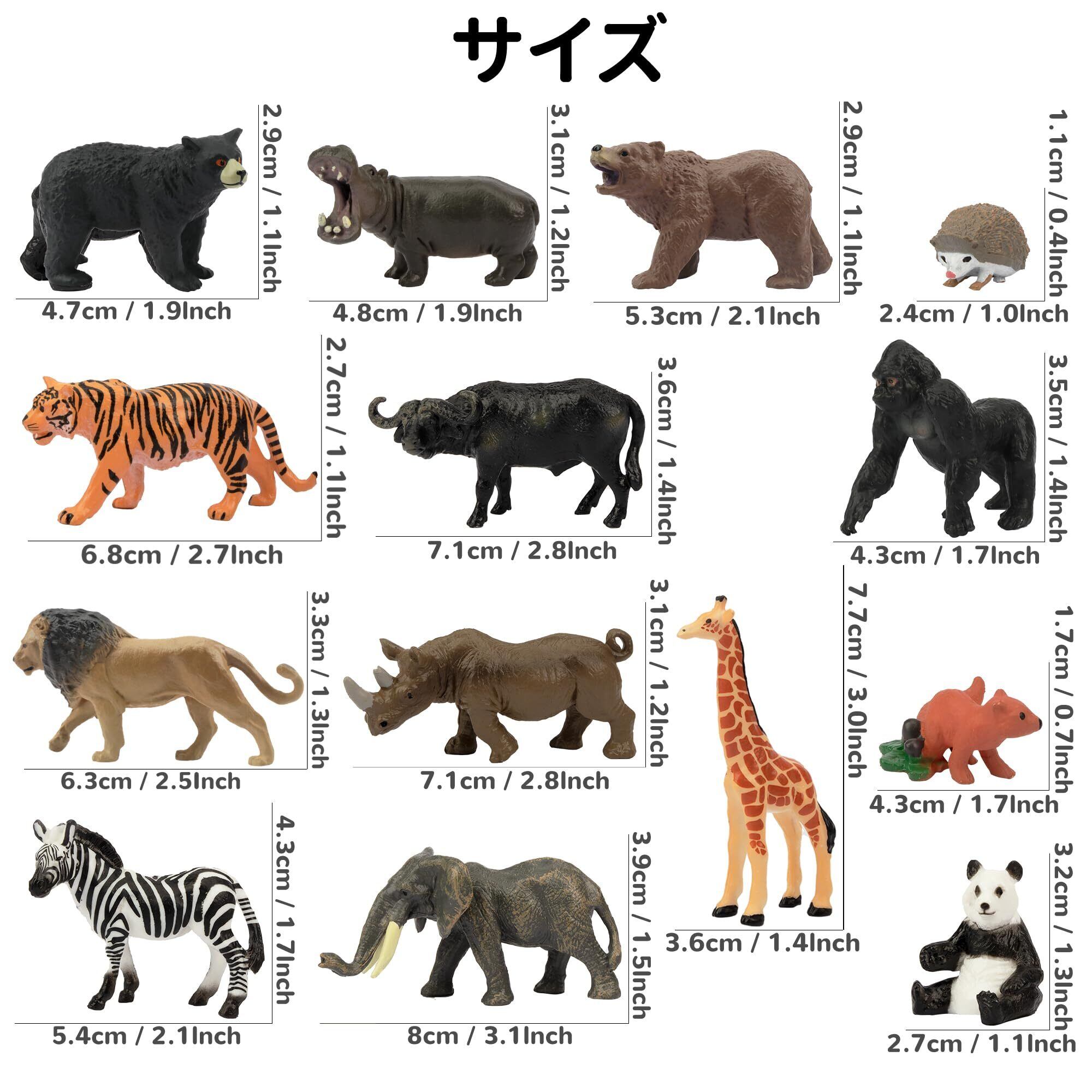 豊富なセット内容・14種類入:ミニ野生動物フィギュアセットです。陸地、川に生息していることのミニ動物があります。小さな動物園のようです。サイズは2.7CM~8CMです。ライオン、キリン、ゴリラ、スイギュウ、黒熊、サイ、カバ、象、パンダ、シマウマ、リス、トラ、ハリネズミ、ヒグマがあります。