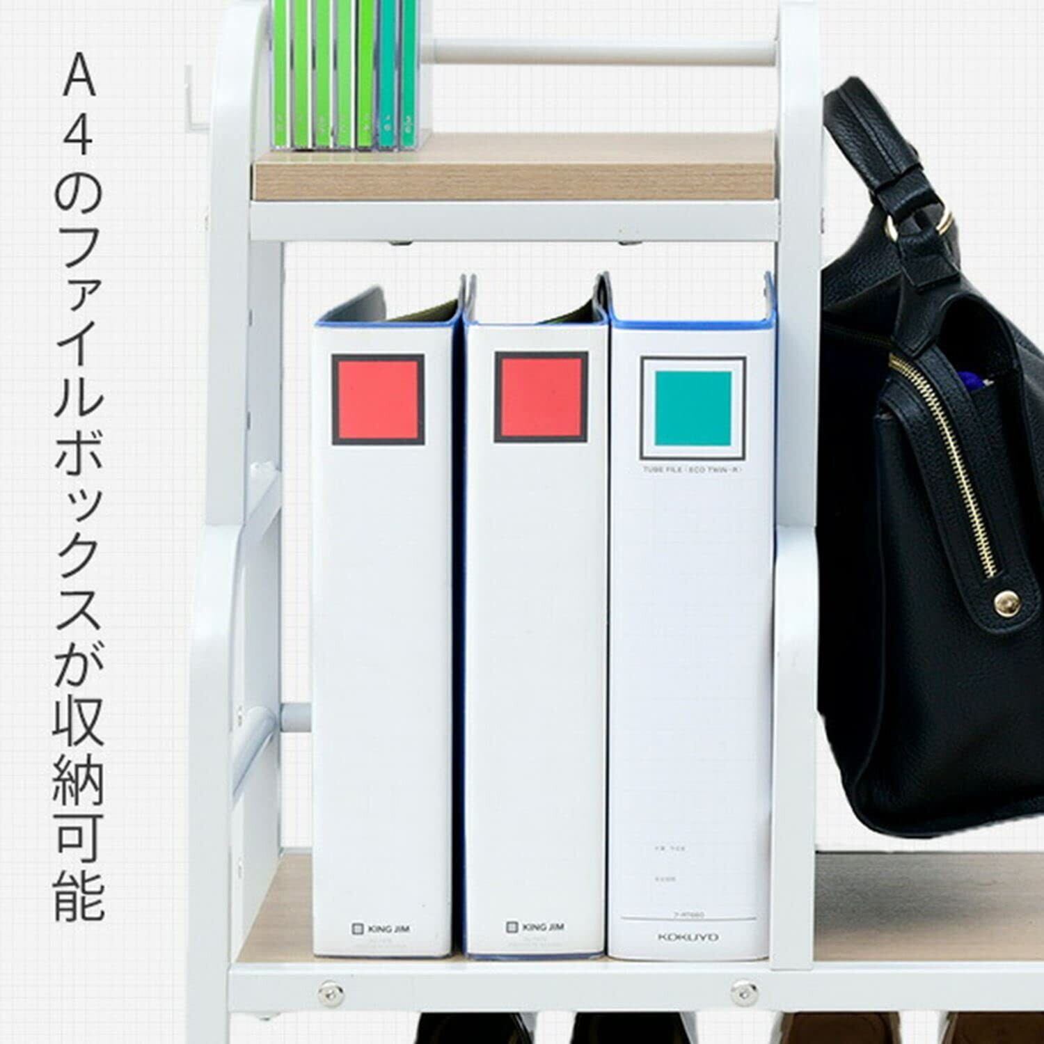 下棚(小)には大きめバッグも直置きできます。また、両サイドにはフックが付いているので、バッグや折りたたみ傘などの引っ掛け収納にオススメです。上棚は高さを3段階で調節可能できます(上棚を一番上で設置した時のみ下棚にA4ファイルを収納できます。)小物類の収納にオススメです。