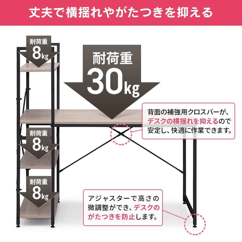 このデスクは、デスク天板の耐荷重が約30kg、棚板の耐荷重が約8kgです。ラックに重い物を置く場合は、重量を超えないようにしてください。組み立て時は、注意して組み立ててください。正しく組み立てないと、安定性に影響する可能性があります。