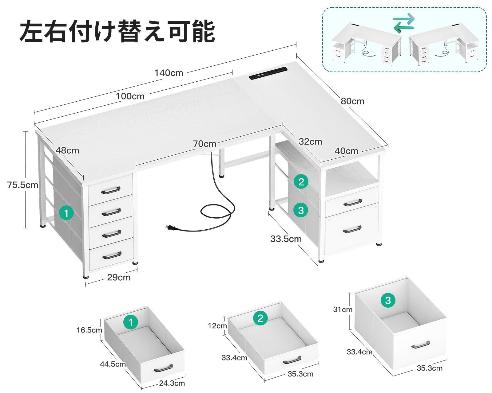 AODK パソコンデスク 引き出し6杯付き ゲーミングデスク コンセント付き l字デスク デスク 机 幅140 pcデスク 棚付き desk 収納 ワーク オフィスデスク 在宅勤務 仕事用 組立簡単 ホワイト
