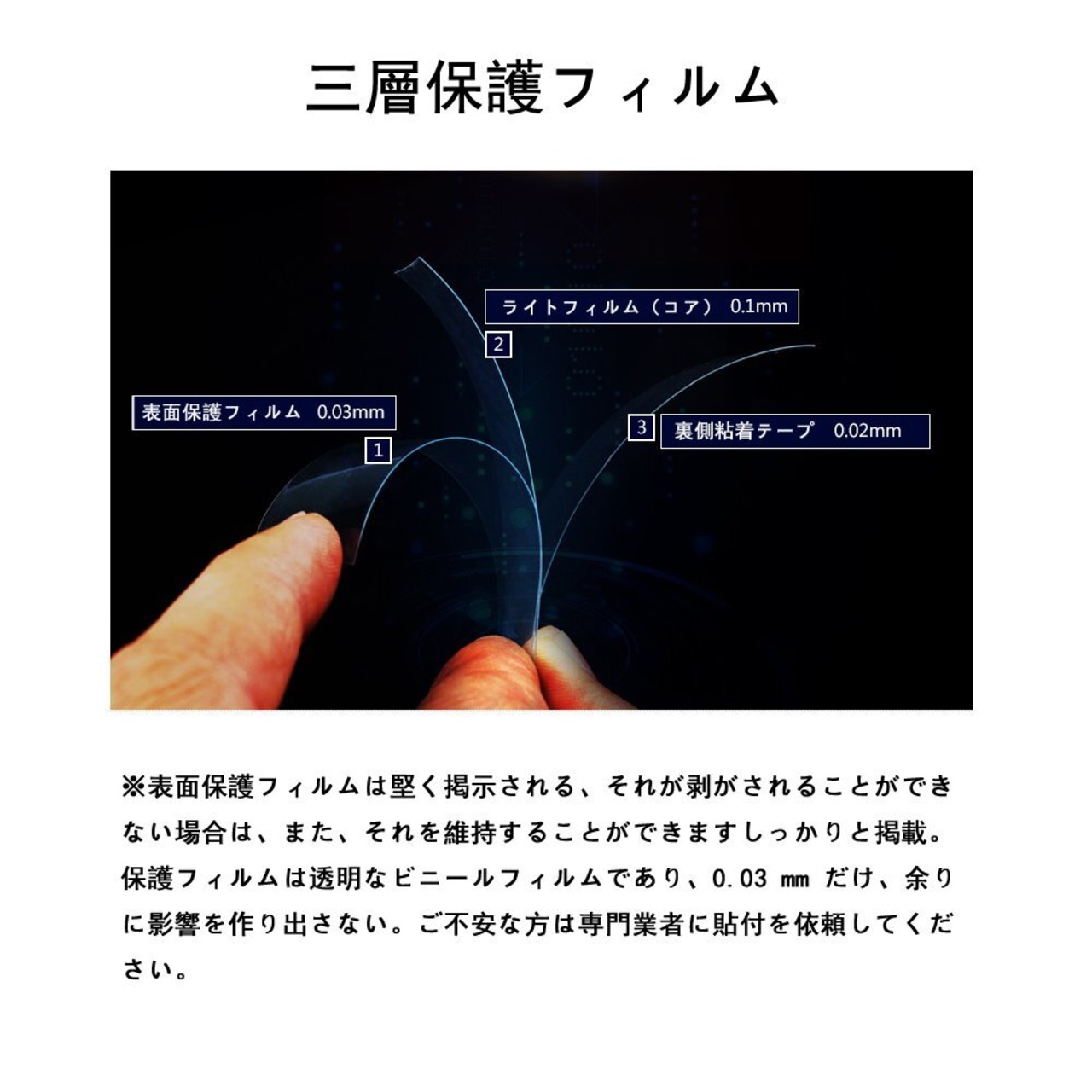 ※表面保護フィルムは堅く掲示される、それが剥がされることができない場合は、また、それを維持することができますしっかりと掲載。保護フィルムは透明なビニールフィルムであり、0.03 mm だけ、余りに影響を作り出さない。ご不安な方は専門業者に貼付を依頼してください。