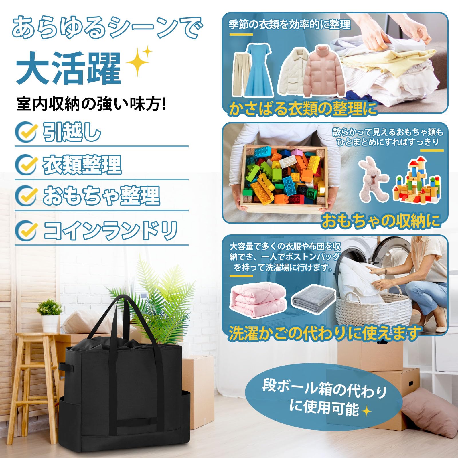 【折り畳み式・持ち運びが簡単】折り畳み式大容量トートバッグ、使わないときは折りたたんでコンパクトに収納可能です。家にいる間、布団や衣類を入れて押入れに置いておくのも、旅行時のサブバッグでお持ちの際も、車に積んでおいてもかさ張りません。ご家庭の防災用品として、日用品をたっぷり収納できます。