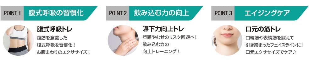 口輪筋のトレーニング、腹式呼吸の習慣化、嚥下障害の予防トレーニングなど