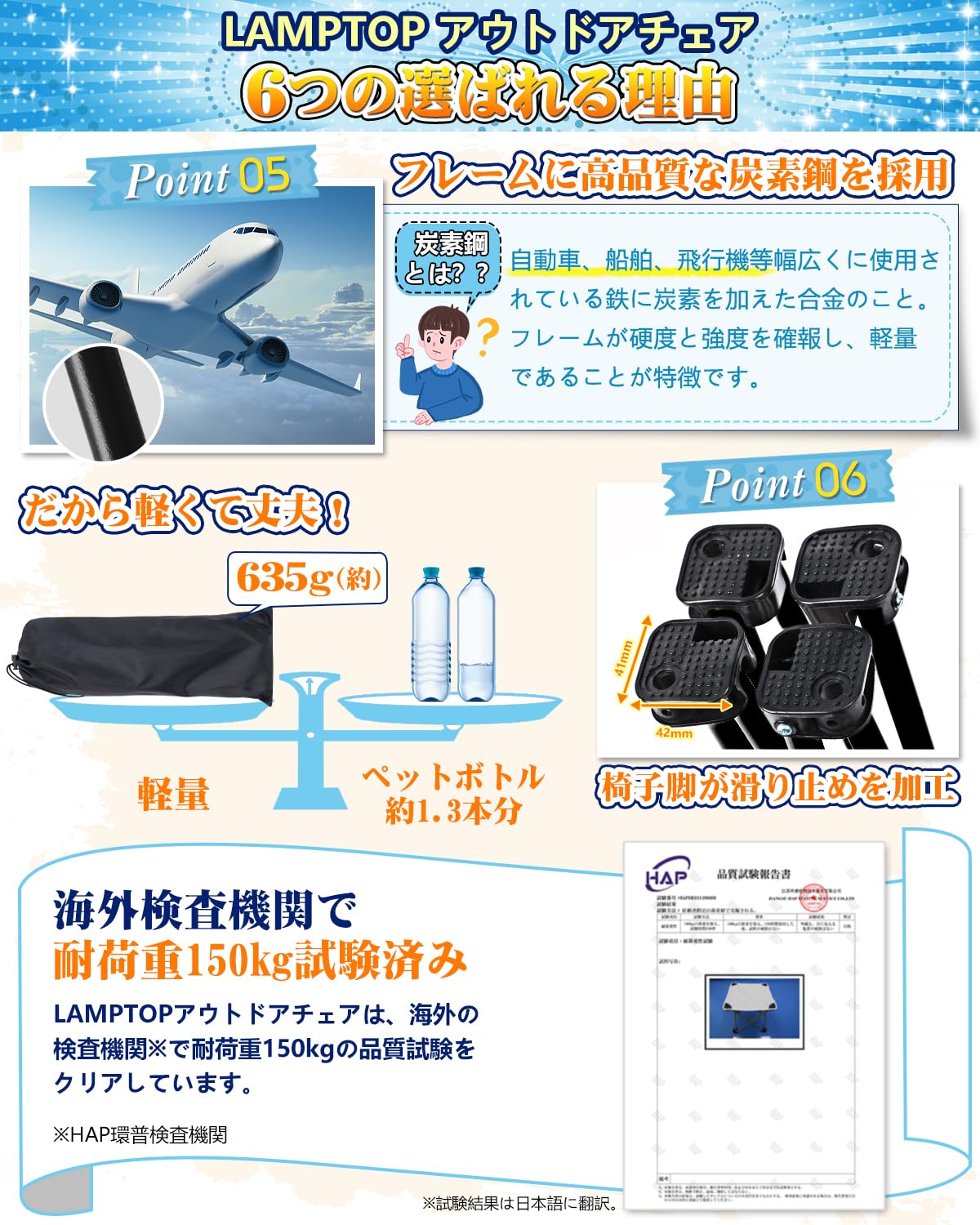 【4本足による安定感、耐荷重180kg】航空宇宙品質のアルミニウム合金で作られた焚き火チェア、フレームは14mmまで厚くなり、軽さと堅牢性のバランスが良い。 X型の安定した支持構造で、150kgまでの耐荷重性を実現。(海外の第三者試験機関による180kgの荷重試験に合格)市販の3本足チェアに比べ、4本の足は厚くなった滑り止め設計で、ズレにくく、安定性も抜群。 オフィスやお部屋で足の踏み台にして、足元に置いて踏むこともできます。