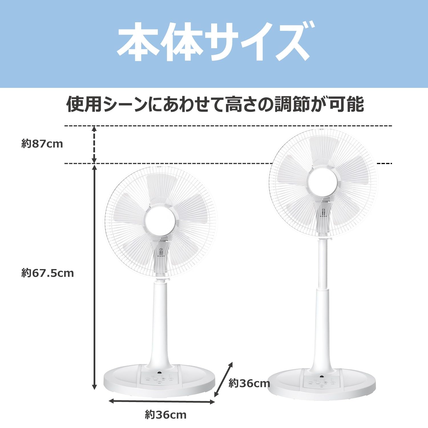 ・サイズ:約幅36×奥行36×高さ67.5-87cm ・本体重量:約3kg ・電源:AC100V 50/60Hz共用 ・消費電力:31/36W ・コード長:約1.6m ・付属品:リモコン、リモコンホルダー、ボタン電池(CR2025)×1個、取扱説明書(保証書付)