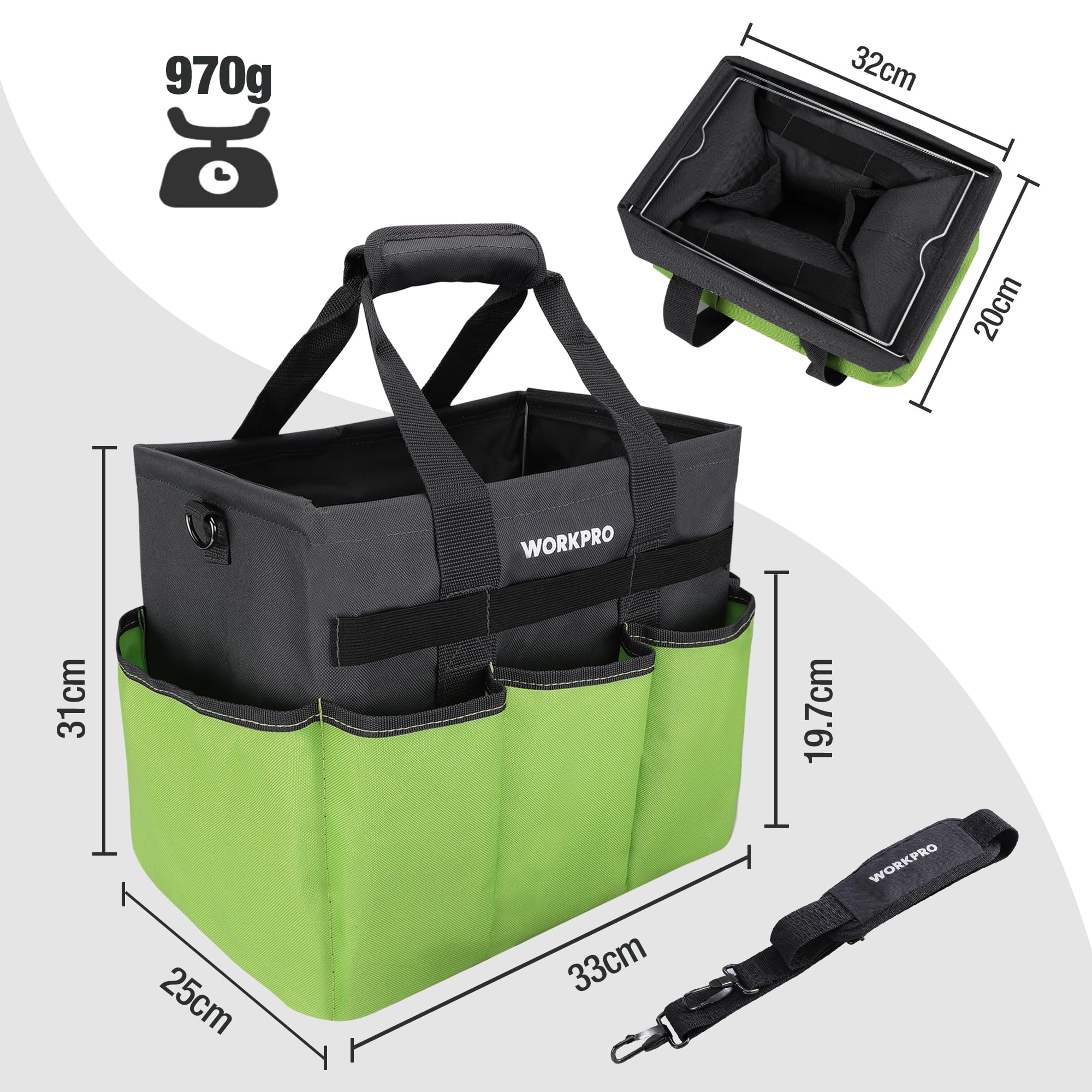 WORKPRO ツールバッグ 工具バッグ 工具入れ 工具袋 収納コンテナ ツールバッグ 幅330mm×奥250mm×高310mm 肩掛けベルト付き 大口収納 大容量 400*400Dオックスフォード プラスチック底部 アウトドア用 運搬用 作業用 持ち運び便利