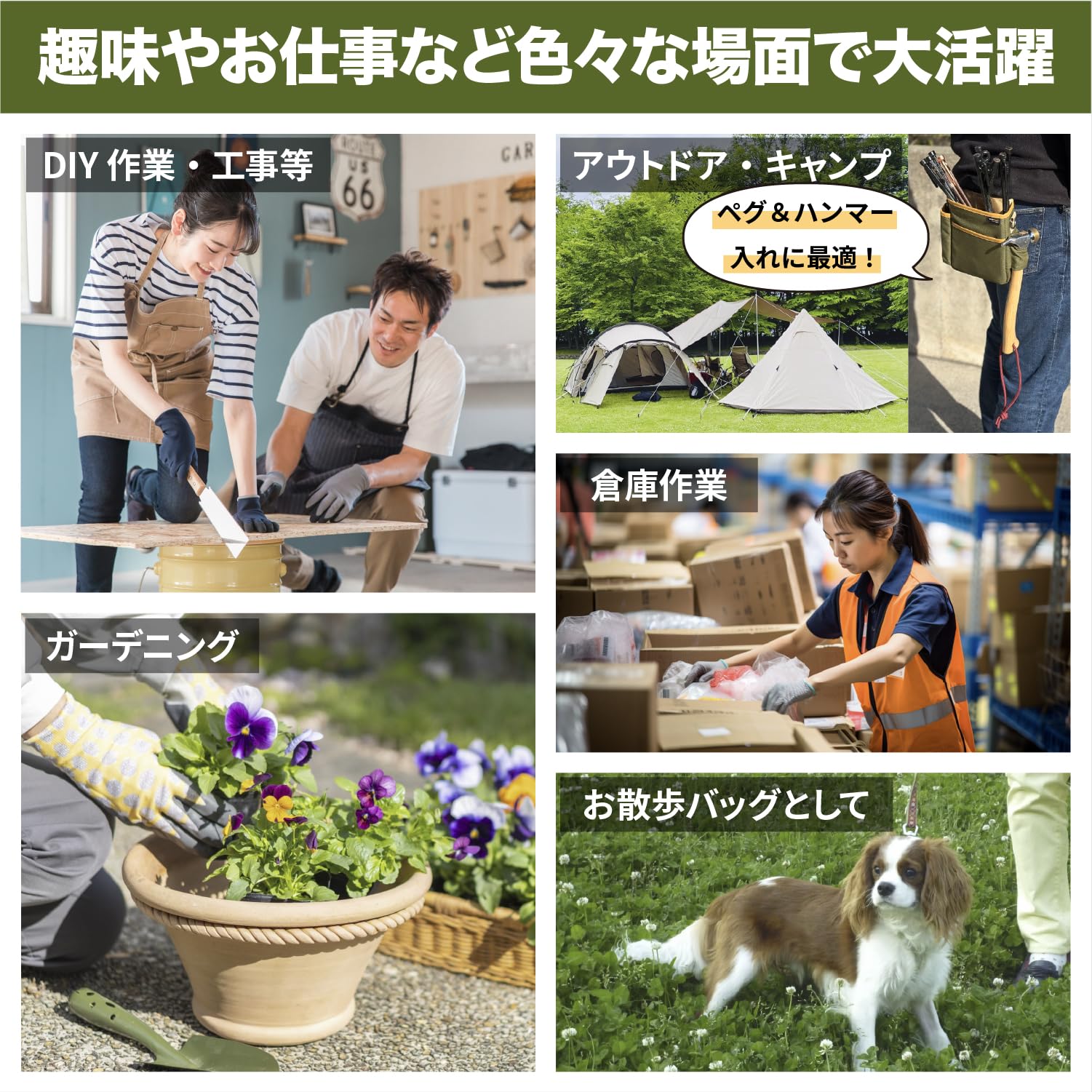 【1つだけであらゆるシーンで大活躍】カジュアルスタイルの日常使いから、DIY作業、ガーデニング、キャンプやハイキングなどのアウトドアや道具を入れておく倉庫作業などのお仕事、飲み物とタオルを入れて軽作業や、ペットのお散歩バッグとしても大活躍します。 シーンに応じてお好みのスタイルでご活用いただけます。