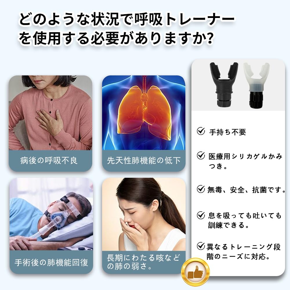 2.コンパクト設計、軽量で耐久性:コンパクトで軽量、耐久性に優れ、取り外しや再使用が簡単です。1日2〜3回、各2分間の使用で、簡単な吸気と呼気のモードにより肺活量を大幅に増加させます。