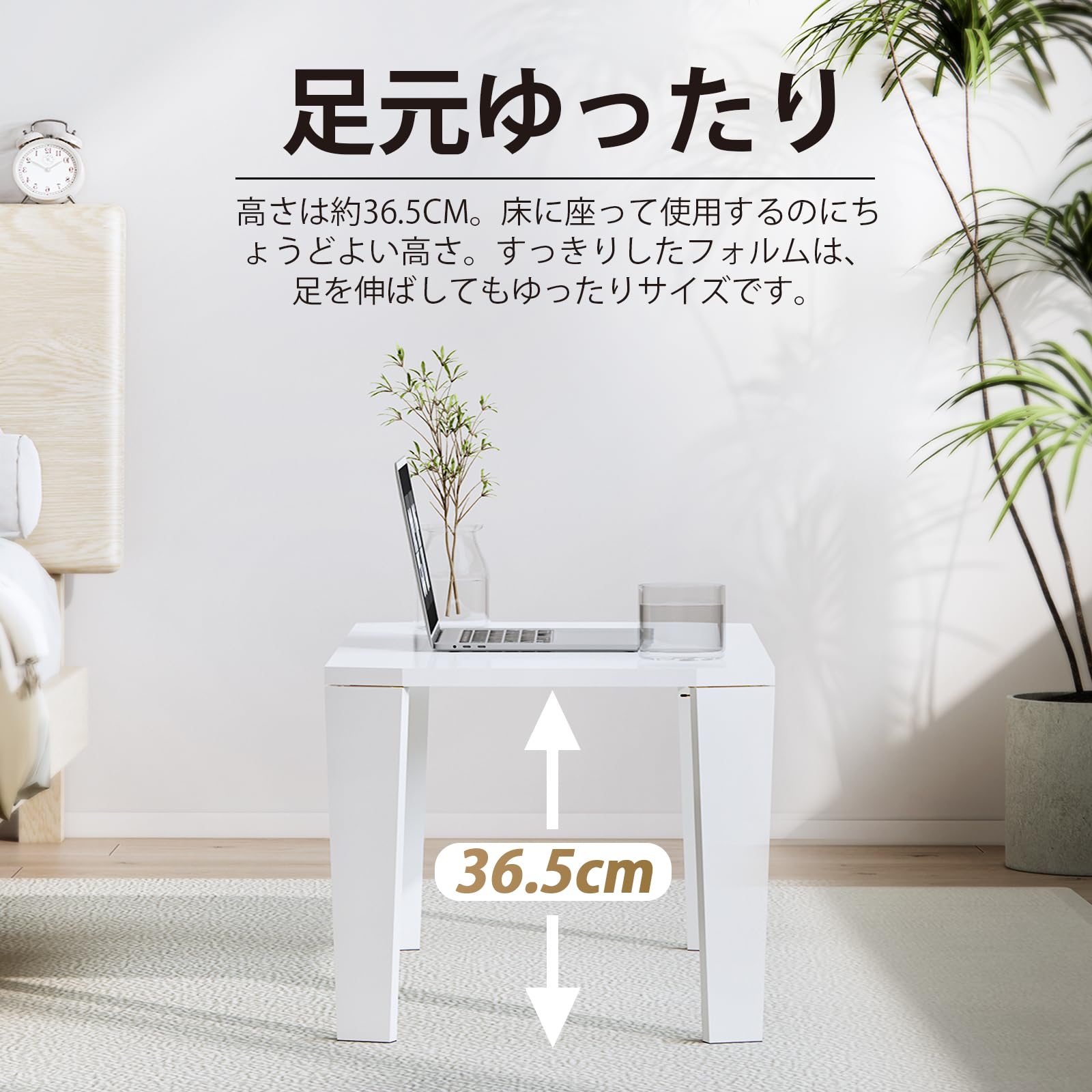 【製品仕様】商品サイズ:約W80×D40×H36.5cm。カラー:ホワイト。重量:約4.7kg。 組み立て不要、完成品のままお手元に届きます。移動便利な折りたたみ式ローテーブルは固定ロックを押すだけで脚を折りたためる簡単な仕様です。折り畳み時の厚みが約7cmで、隙間収納も可能です。
