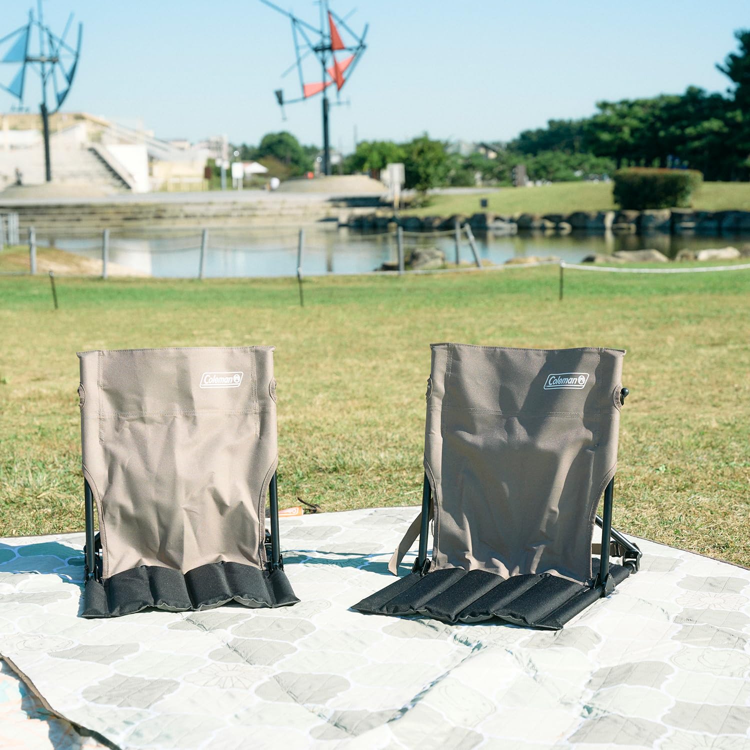 【座椅子スタイル】座面にはクッション入り、背もたれはフレーム入りでしっかり体を支えてくれるので、地べたに長時間座るシチュエーションでも疲れず快適に過ごせます。