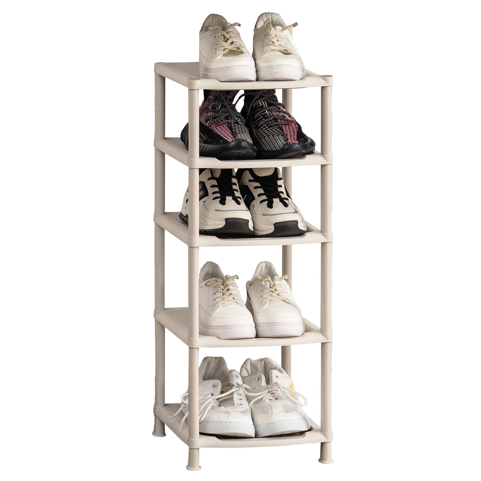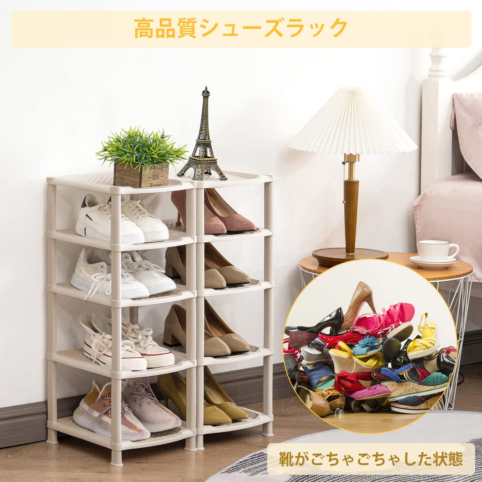 YOUDENOVA シューズラック スリム 靴収納 靴棚 省スペース 大容量 組み立て式 靴置き タワー コンパクト ポリプロピレン製 斜め置き 滑り止め トレー 狭い 玄関 廊下 クローゼット アパート用 靴箱 下駄箱 靴入れ(ベージュ・5段・26x33x66cm)