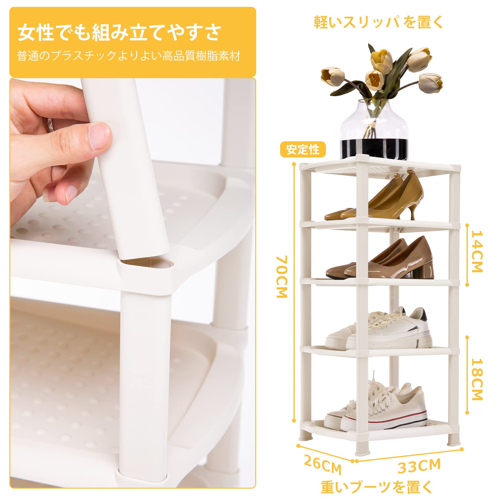 【スリム・省スペース】この縦長なシューズラックは専門に狭い場所に対応したの設計です。「サイズ:33x26x66cm」玄関、寝室、バスルーム、デパートの僅かな隙間などの場所に置くことができ、部屋をすっきり見せます。5段ラックには大人靴5足、各段に1足靴置きことができ、靴収納の需要を満たすと同時によりスペースを節約できます。一人暮らしでも家族でも、あなたに最適な選択です。