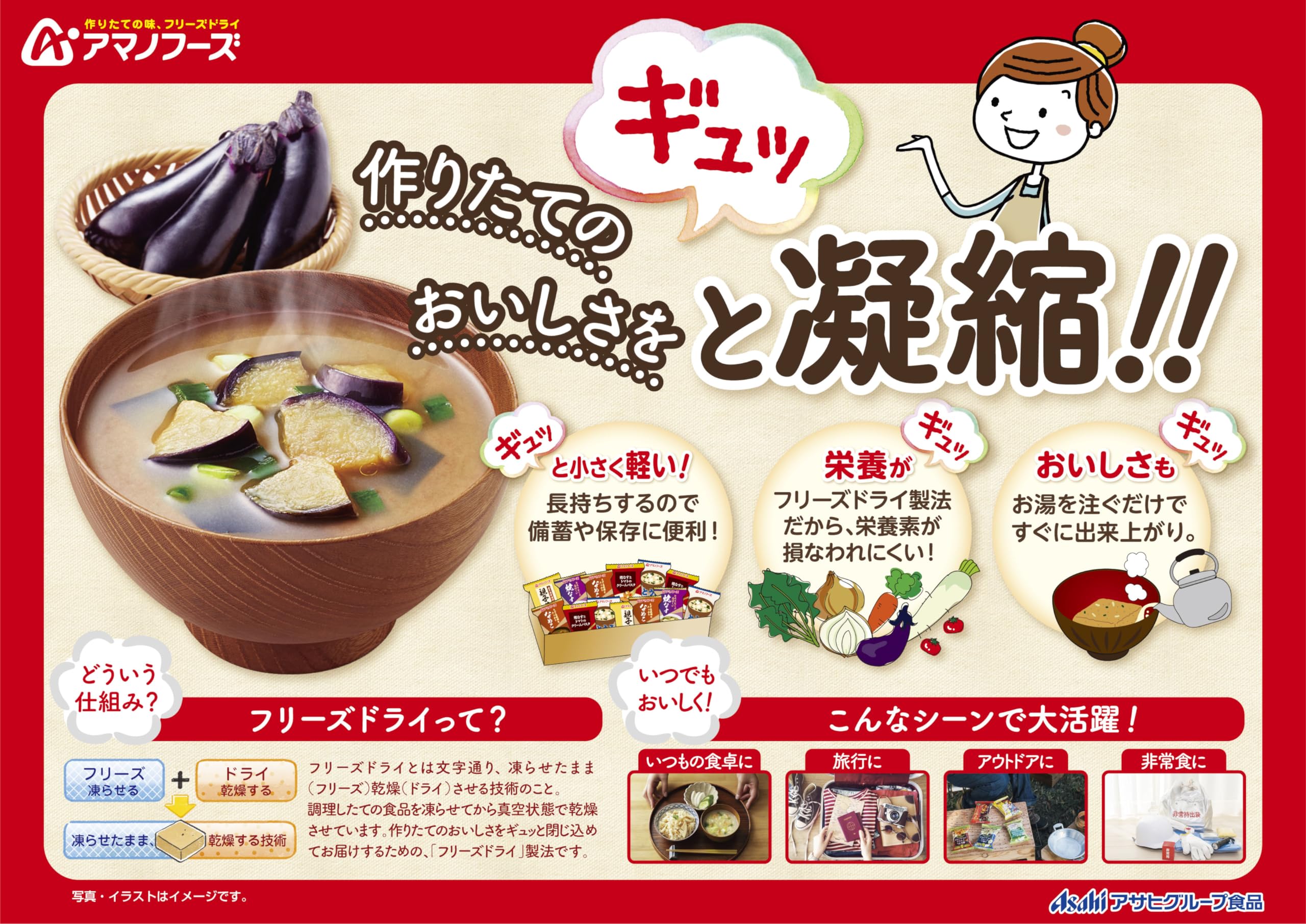 いつものおみそ汁「なす」「とうふ」「なめこ(赤だし)」「赤だし(三つ葉入り)」「野菜」の詰め合わせ(フリーズドライ食品)です。