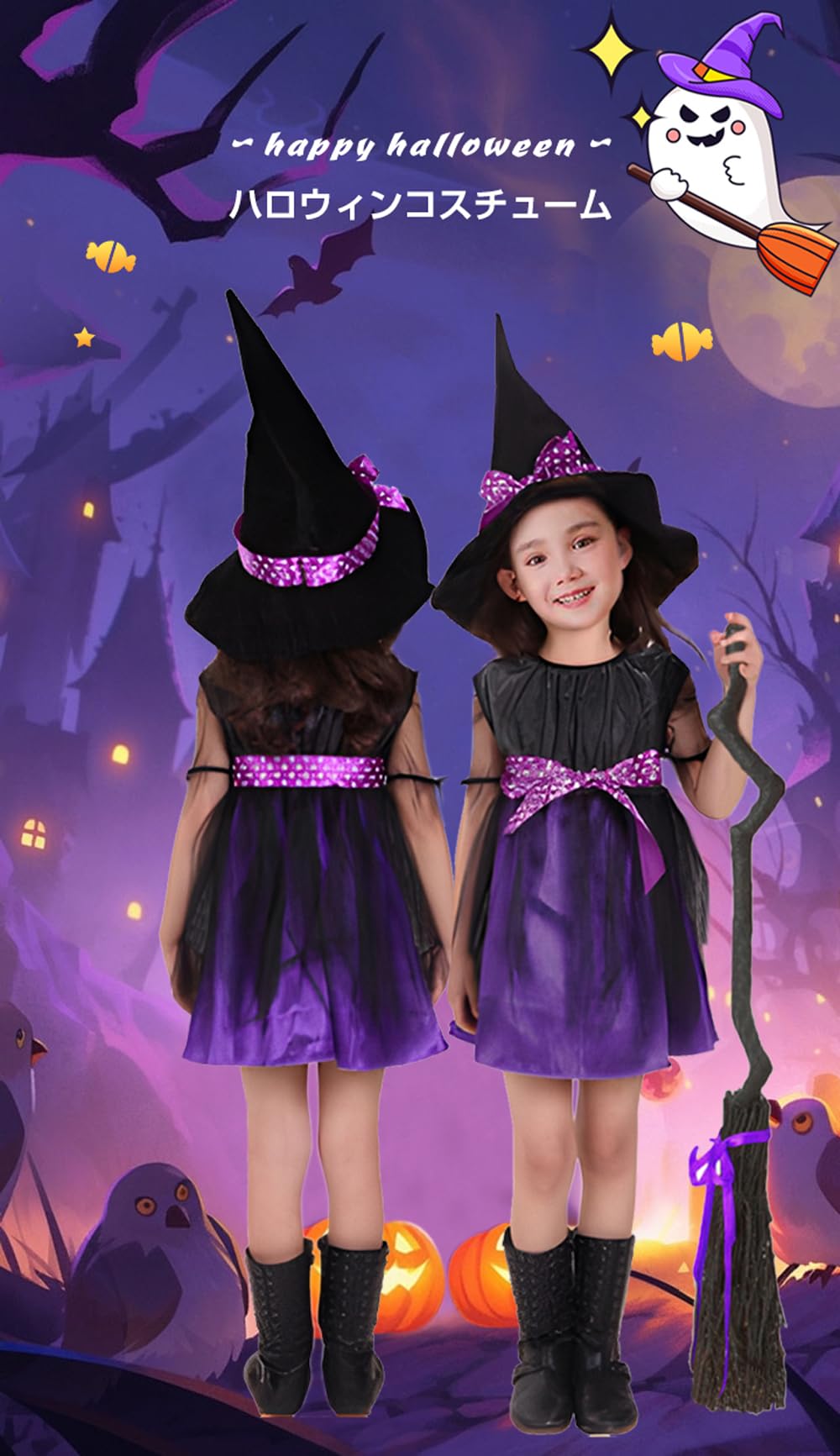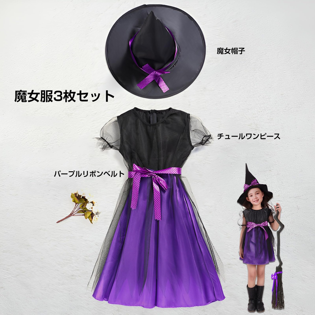 [ニューキング] ハロウィン コスプレ 子供 魔女 ドレス+帽子+ベルト三点セット 女の子 仮装 キッズ 衣装 90/100/110/120cm対応