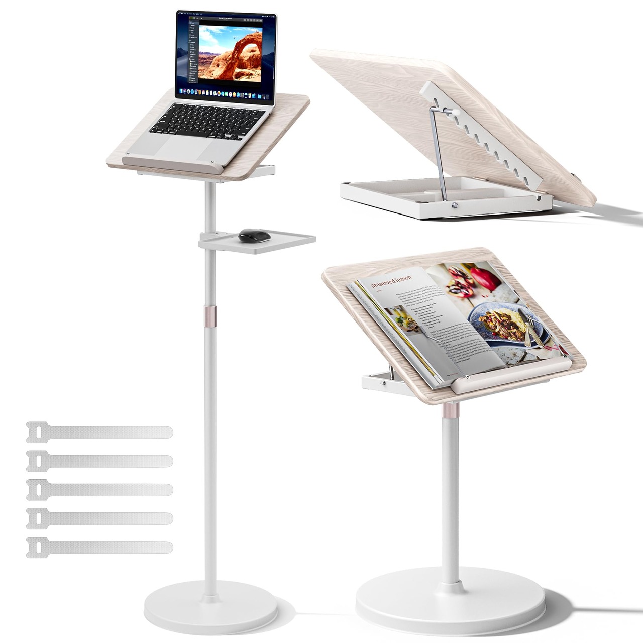 Haweah 2 in 1調整可能なブックスタンド - 床置き&デスクトップ両用ブックホルダー、高さ調整可能60-132cm、楽譜・レシピ・タブレット・ノートパソコン用の弾性ページクリップ付き - ホワイト
