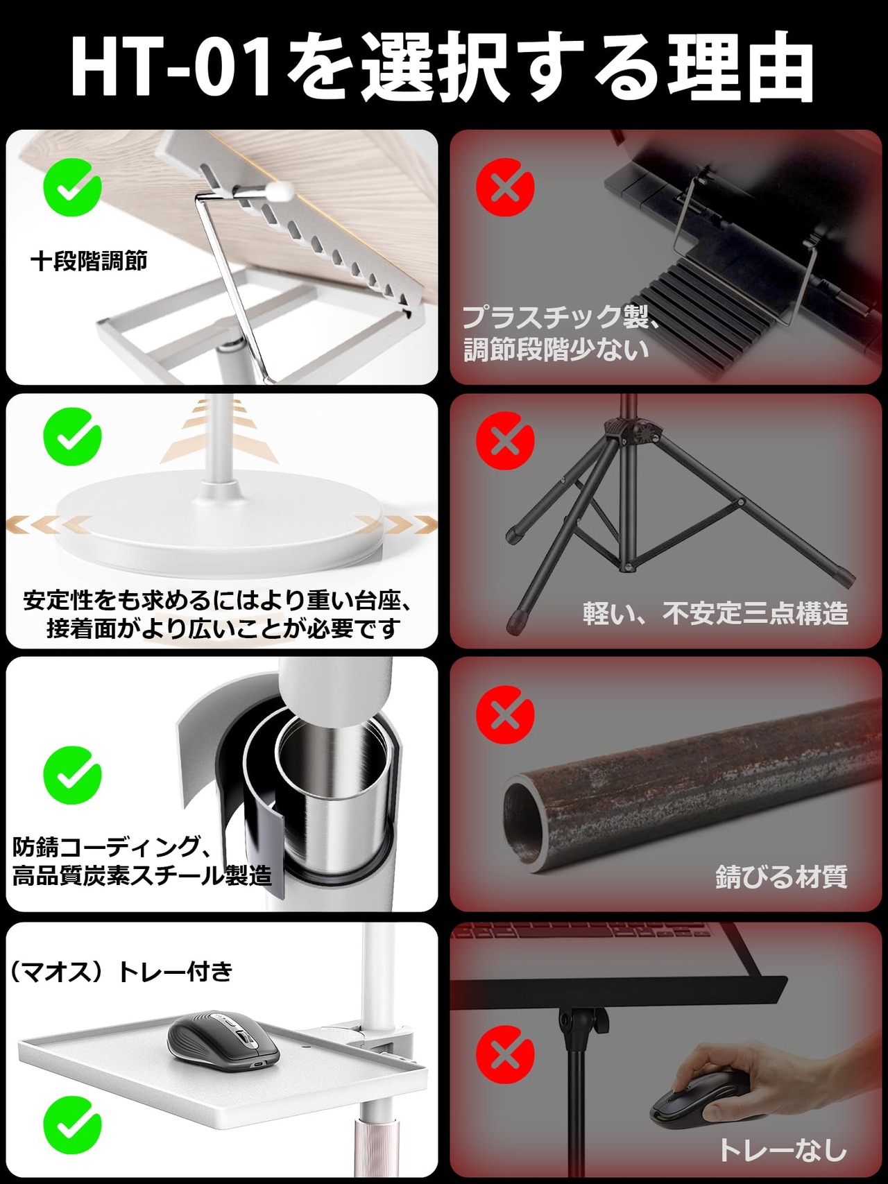 【フロア・卓上の 2WAY 使用】 品番HT-01は多用途ブックスタンドです。フロア式(床置き)でも取り外して卓上でもご利用可能です。組み立てはとても簡単で、誰どもどこでもすぐ配置し、人間工学に基づいたデザインで60cm~132cmまで自由に昇降、十段階の角度調整は姿勢や視力をより正しく守りる!安定な構造、高品質な製造、安心と信頼を与えるブックスタンドです。