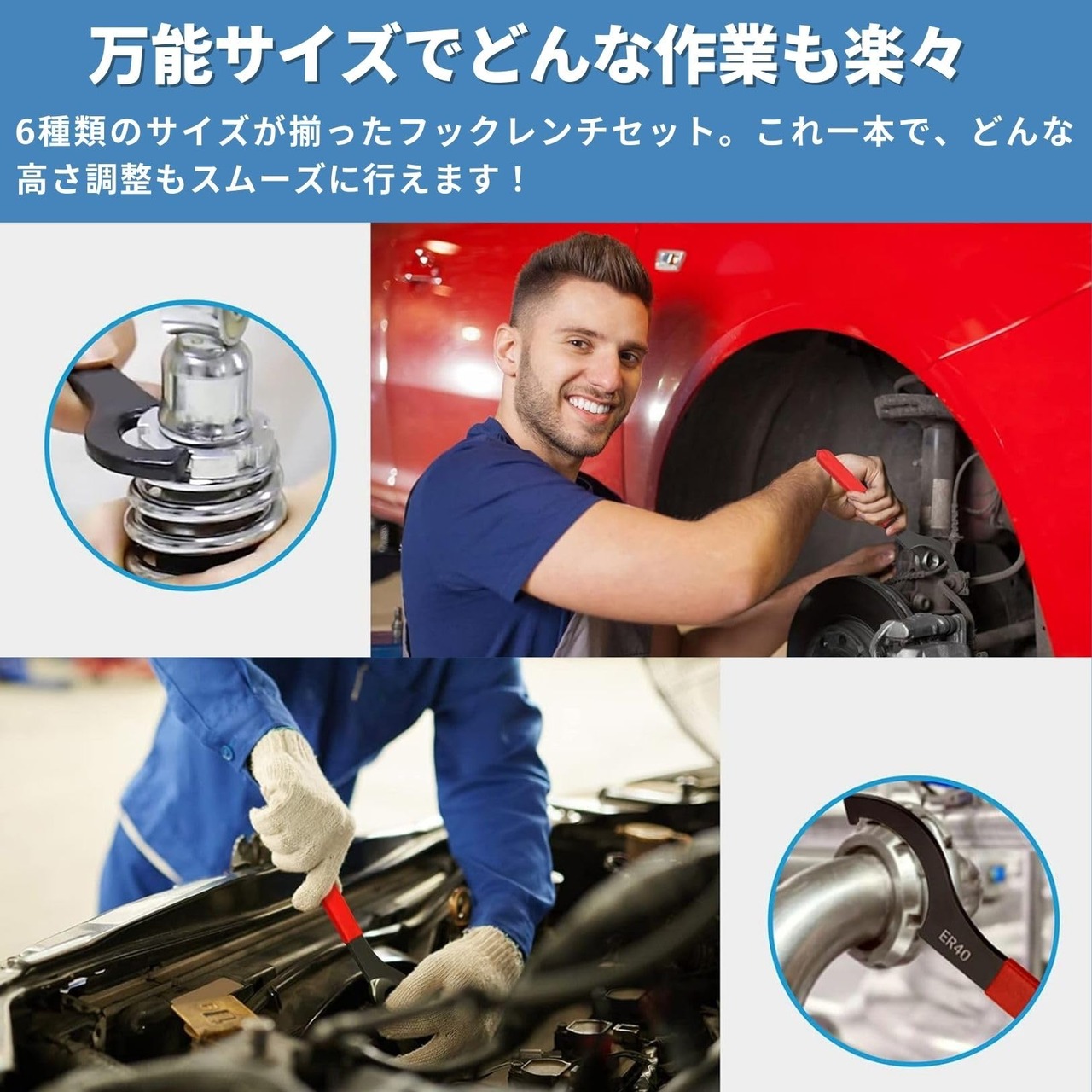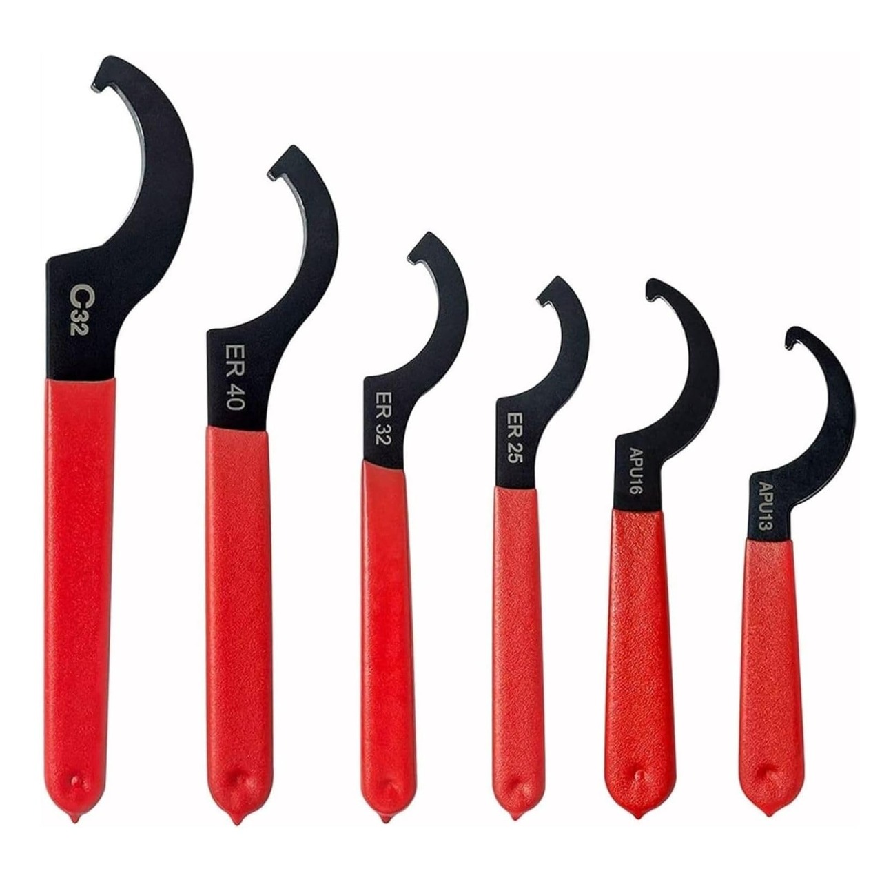 【多様なサイズで万能対応】 この6本セットのフックレンチは、APU13、APU16、ER25、ER32、ER40、C32の6種類の異なるサイズで提供されています。車体の高さを調整する際に必要なすべてのサイズが揃っているので、どんなニーズにも対応できます。