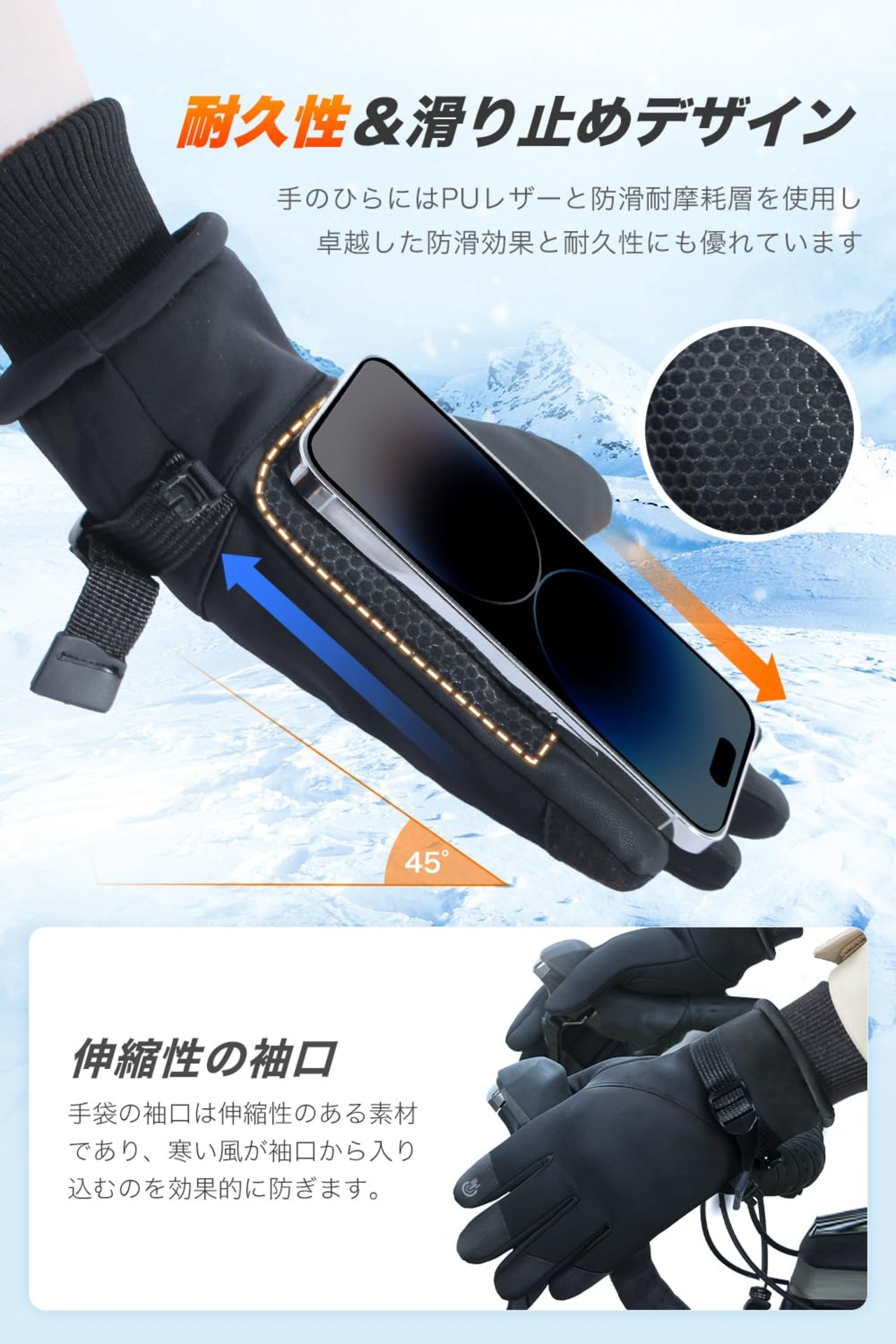 【5本指タッチパネル対応・滑り止めデザイン・手首調整バンド】全指タッチパネルに対応し、手袋を外さずにスマートフォンやタブレットを操作できるため、寒い日でもデバイスの使用が快適です。また、手のひらには高性能な滑り止め加工が施されており、しっかりとしたグリップ力で握りやすくなっています。手首には調整可能なバンドも付いており、フィット感を自由に調整できます。機能性とフィット感を両立させることで、動きやすく使い勝手の良いデザインを実現しています。