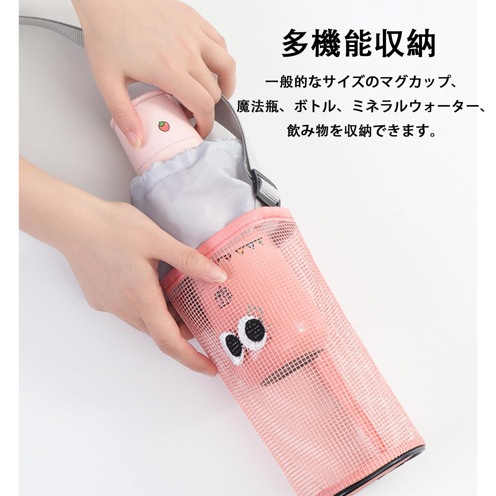 通気性メッシュ素材: メッシュバッグ構造で通気性が良く、結露を防ぎます。ペットボトルや水筒を清潔に保ち、長時間の持ち運びにも最適。