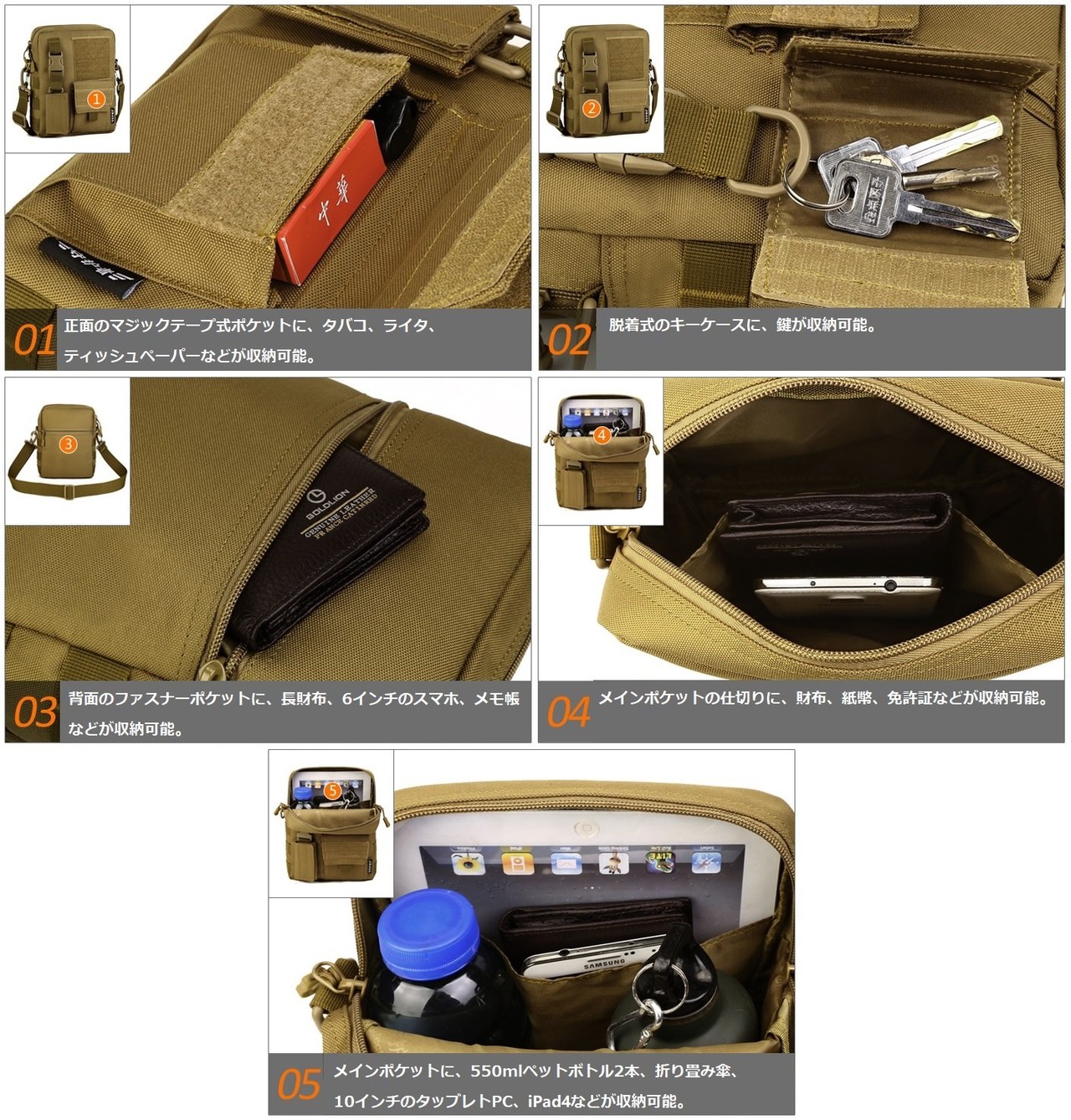 [PHOENIX IKKI] 縦型 キーケース付き 全6色 迷彩 耐水素材 アウトドア ショルダーバッグ 戦術 肩掛けバッグ 軍事ファン向け カバン