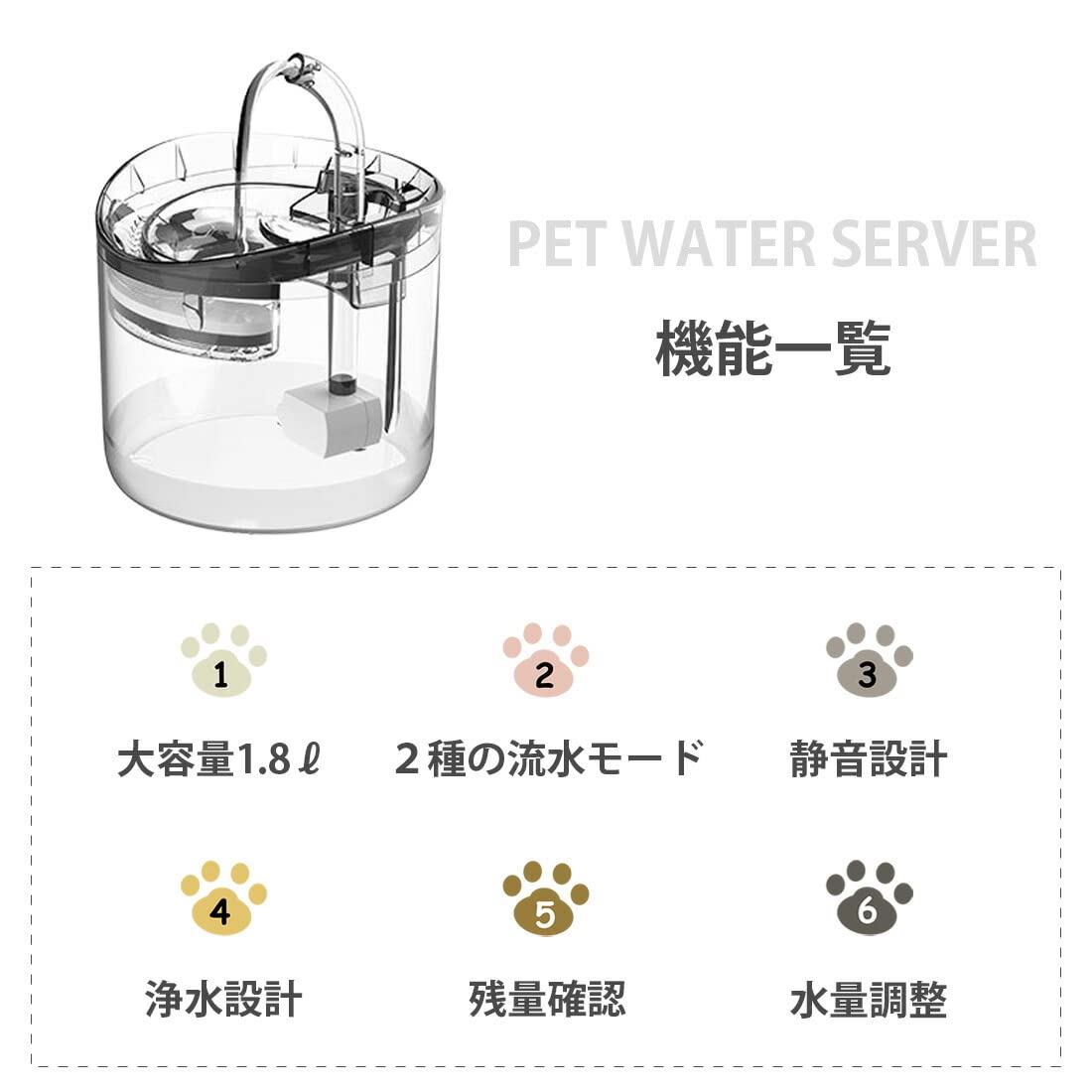 機能一覧:大容量1.8L、2種の流水モード、静音設計、浄水設計、残量確認、水量調整