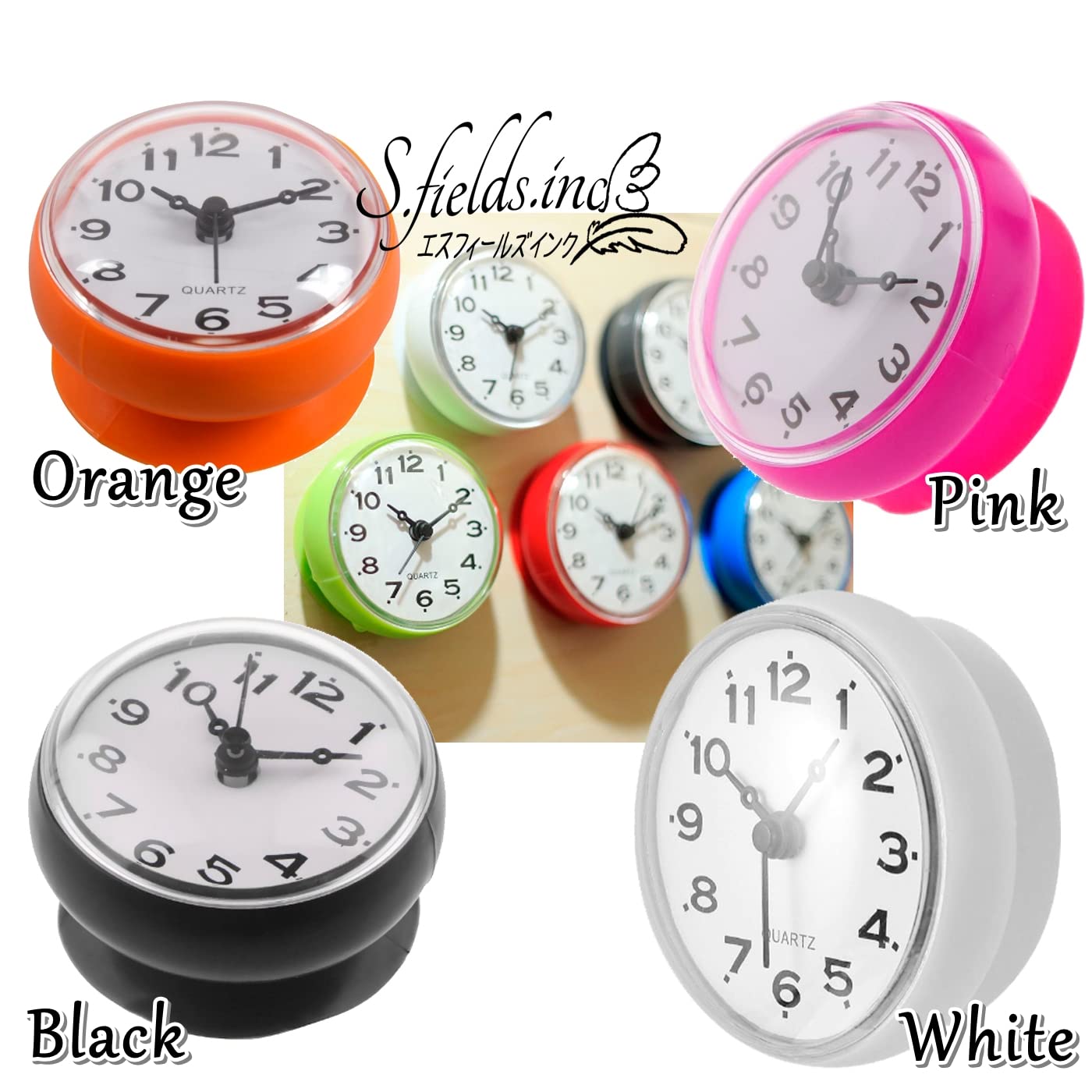 お風呂場やキッチン、冷蔵庫に吸着する吸盤付き貼り付けアナログ時計です。ホワイト、ブラック、ピンク、オレンジの4色からお選びいただけます。