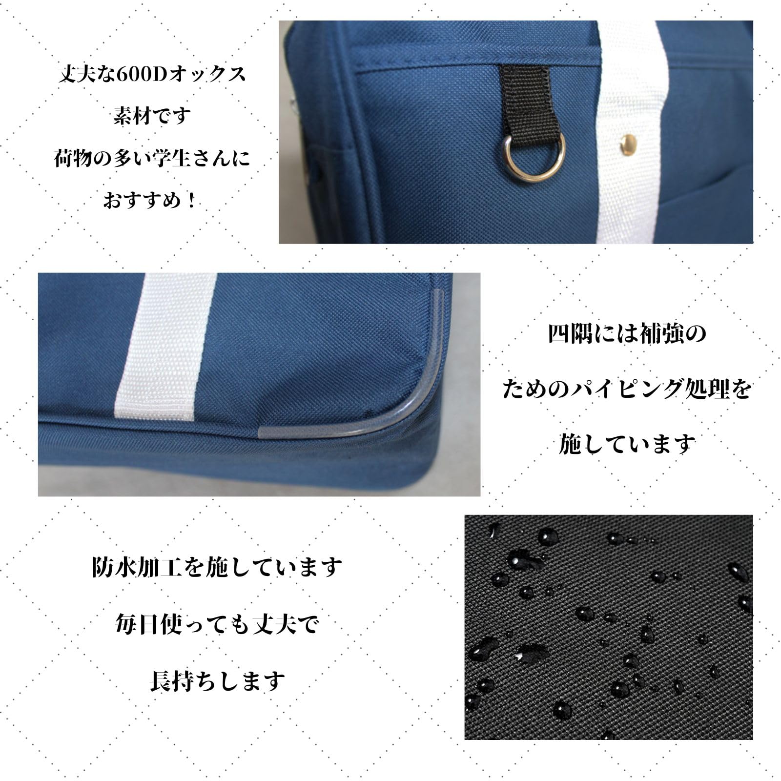 【素材】丈夫な600Dオックス素材です荷物の多い学生さんにおすすめ四隅には補強のためのパイピング処理を施していますので、毎日使っても丈夫で長持ちします