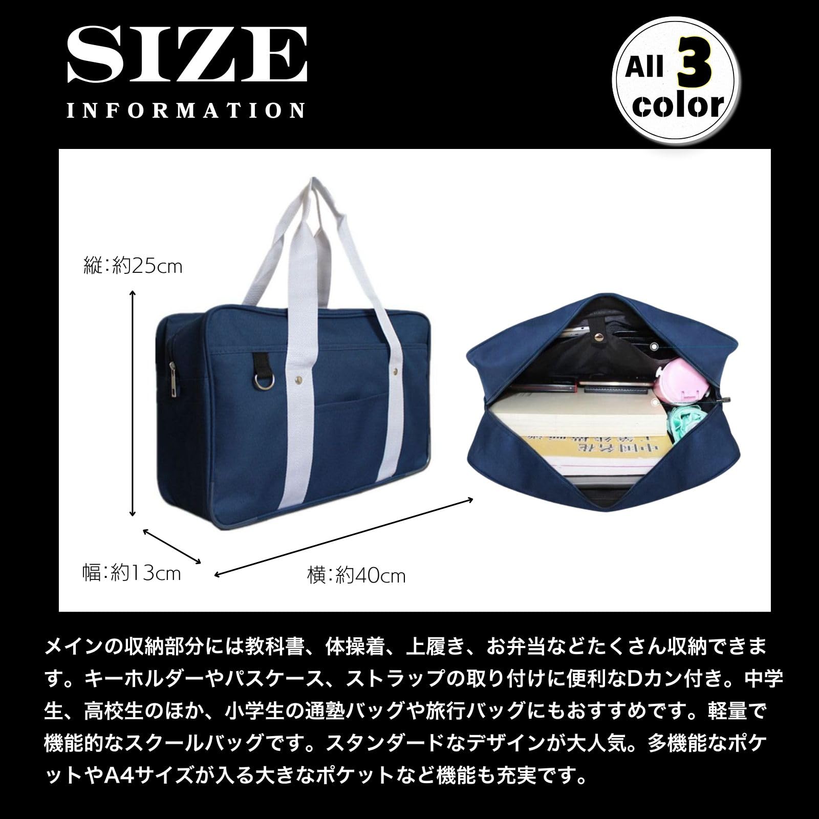 【シンプル・軽量】軽量で機能的なスクールバッグですシンプルなデザインが大人気多機能なポケットやA4サイズが入る大きなポケットなど機能も充実です【素材】丈夫な600Dオックス素材です荷物の多い学生さんにおすすめ四隅には補強のためのパイピング処理を施していますので、毎日使っても丈夫で長持ちします【活用シーン】軽くて持ち運びラクラクなボストンバッグです旅行、スポーツジム、クラブ部活動、合宿、イベント、通学、修学旅行や出張、緊急災害用などに、学生から大人まで使えるバッグです【多機能】メインの収納部分には教科書、体操着、上履き、お弁当などたくさん収納できますキーホルダーやパスケース、ストラップの取り付けに便利なDカン付き中学生、高校生のほか、小学生の通塾バッグや旅行バッグにもおすすめです・【カラー・サイズ】ネイビー、ブラック幅40cm 高さ25cm 厚み13cmポケット:フロントファスナーポケット、カードポケット、メイン収納、内ポケット・重量340g