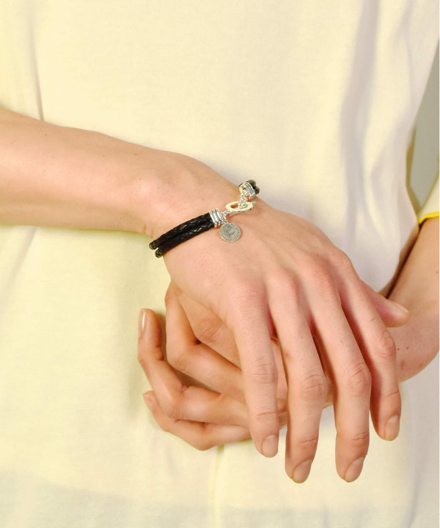 2本のレザーを1つに束ねたTバータイプのレザーブレスレット。