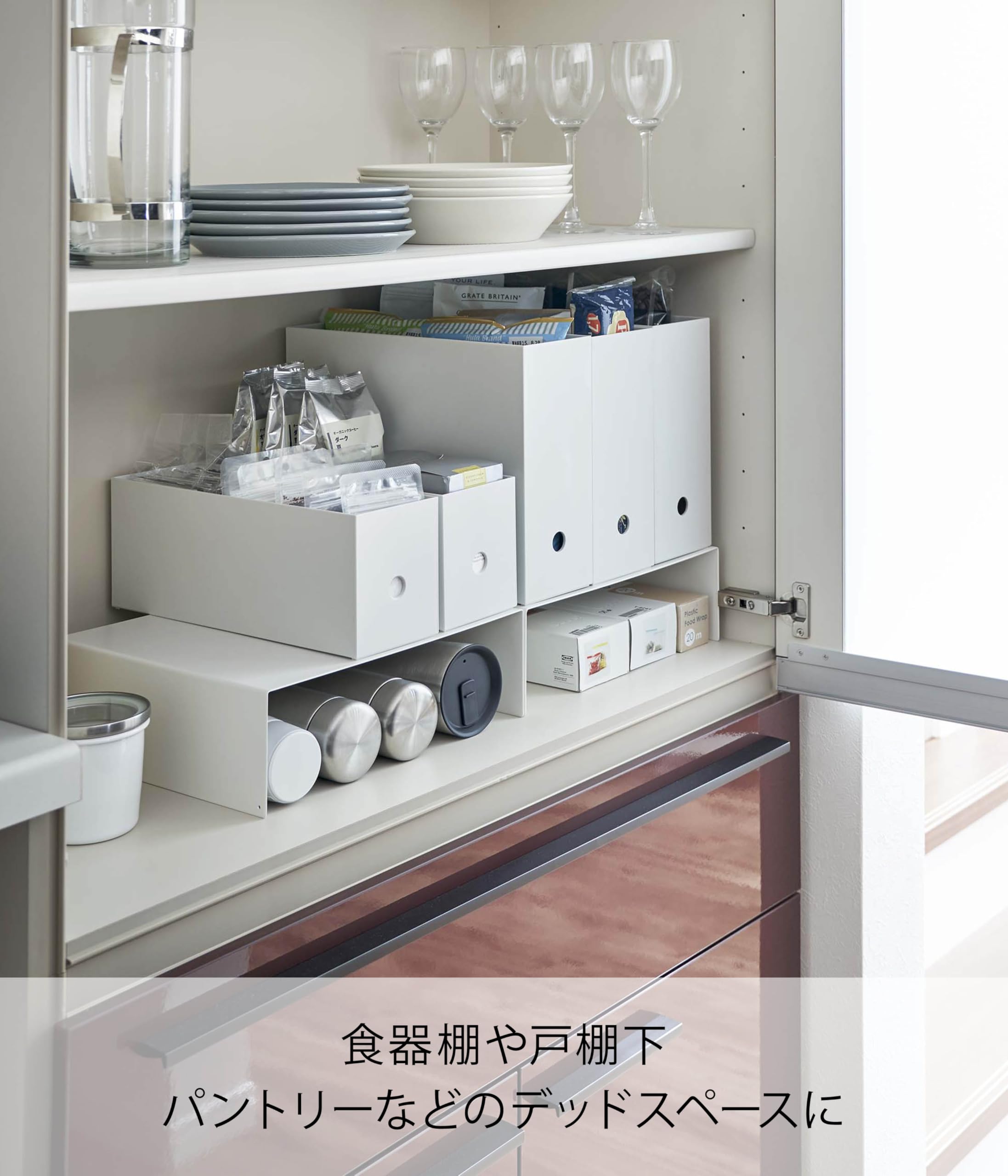 収納ボックスの下のスペースを有効活用。マグボトルなどの収納に便利な2個組のラック。食器棚や戸棚下、パントリーなどでマグボトルやフリーザーバッグのボックスなどを収納するのにピッタリなラックです。高さが約9.5㎝なので背の低い奥行があるものの収納に最適です。
