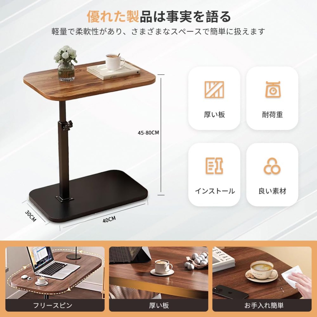 商品説明: YbiOKの昇降式サイドテーブルは、リビングルームや寝室、カフェなどの空間に最適なアイテムです。高さは45〜80cmまで自由に調整できるため、使う人のニーズに合わせて快適な高さに設定することが可能です。また、差し込み式の設計により天板が360度回転し、必要なときに必要な位置に移動させることが可能です。 シンプルながらもスタイリッシュなデザインは、どんなインテリアにも自然と溶け込みます。組み立ては非常に簡単で、一人でも短時間で完成させることができます。さらに、コンパクトなサイズなので、狭いスペースでも問題なく設置可能です。 YbiOKのサイドテーブルは、ただのテーブルではなく、あなたの生活をより便利で快適にするパートナーです。リビングルームでのリラックスタイム、寝室での読書時間、カフェでの作業時間など、様々なシーンで活躍すること間違いなしです。