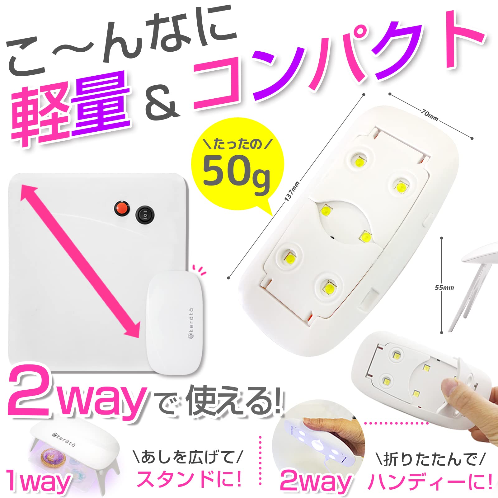 【コンパクト&軽量】 折りたたみ式でとってもコンパクト!収納時も場所を取りません! 重量もわずか50gと軽量だから、持ち運びにもオススメです 脚はおりたたんだままでもハンディーライトとしてお使い頂けます お手持ちのモバイルバッテリーで給電が可能なので、 イベントやワークショップ、 出先でのちょっとしたネイルの手直しにもオススメです 【45秒/120秒のタイマー機能搭載】 ボタンを一回押しで45秒、二回押しで120秒のタイマー機能付き。硬化中に別の作業ができて便利です