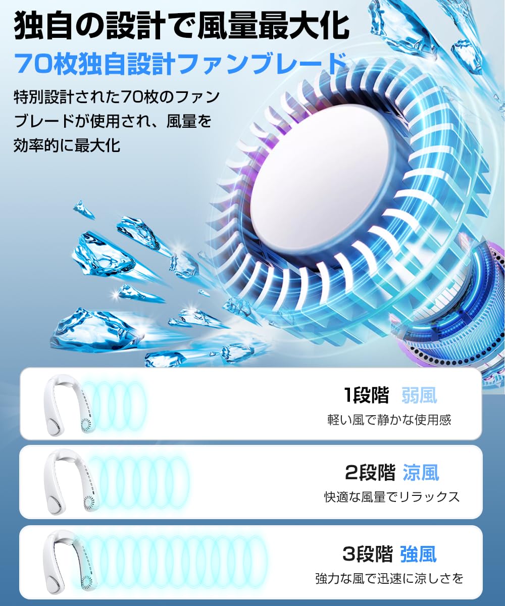 首掛け扇風機 冷却ファン 【2025新型・瞬間冷感・360°上下送風】 軽量 小型 Type-C 急速充電 ネッククーラー 羽なし 静音 3段階風量調節 大容量バッテリー 長時間連続使用 持ち運び便利 扇風機 おしゃれ 携帯扇風機 コンパクト 花火大会/通勤通学/アウトドア/熱中症対策/プレゼント