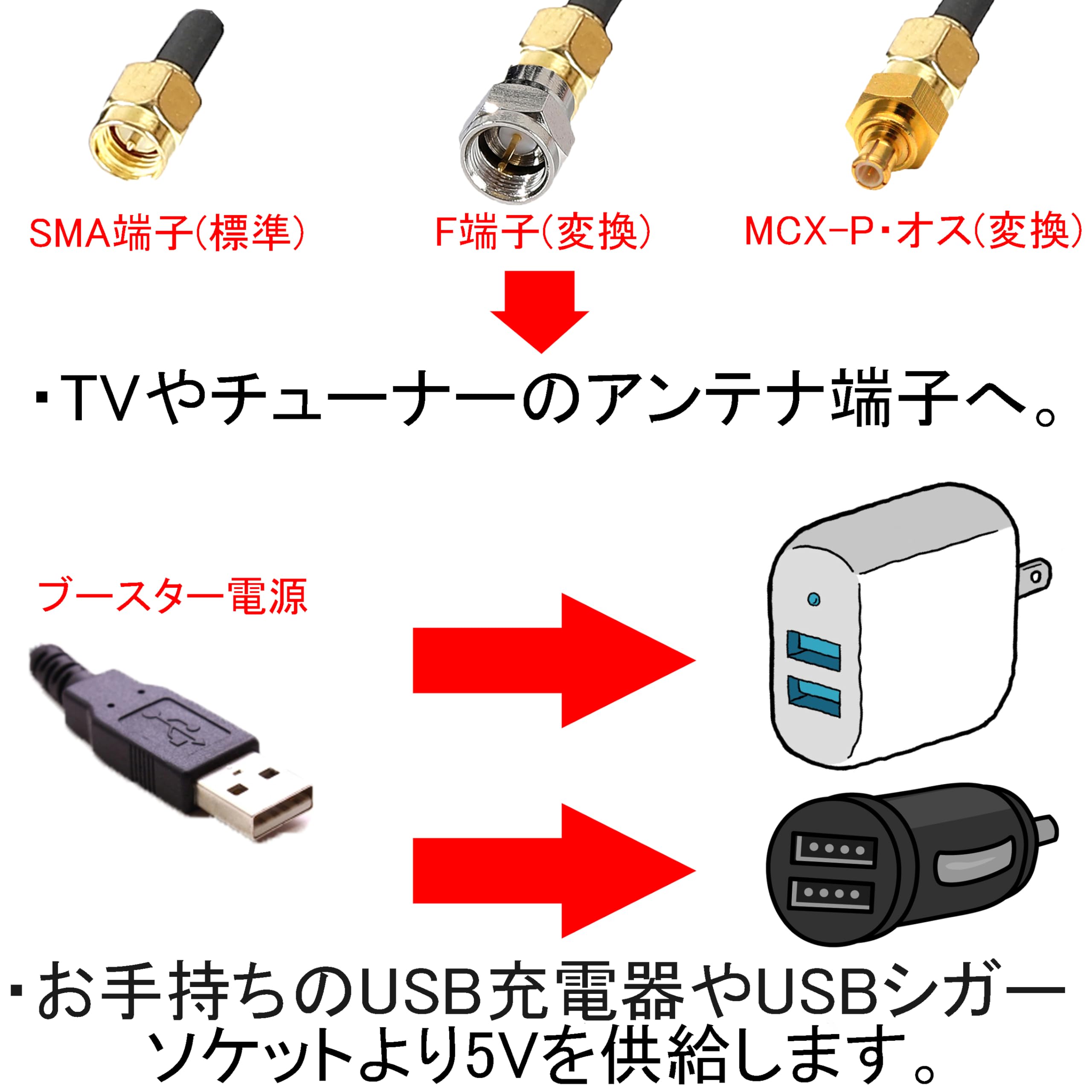 ご好評頂いております、ワンセグ・フルセグ対応の無指向性(電波塔にアンテナを向ける必要が無い)のショートアンテナにブースター搭載。アンテナの受信性能を示すアンテナ利得(感度)も従来型の12db→25dbと大幅にパワーアップ。