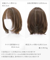 髪の長さ:前髪(ネット際から) 9.5cm サイド(頭頂部から) 約30.5cm 全長(頭頂部から) 約36cm 襟足(ネット際から) 約9.5cm ※いずれも自然長(カールを伸ばさない状態)での計測です。若干の誤差がある場合があります。重量:93g