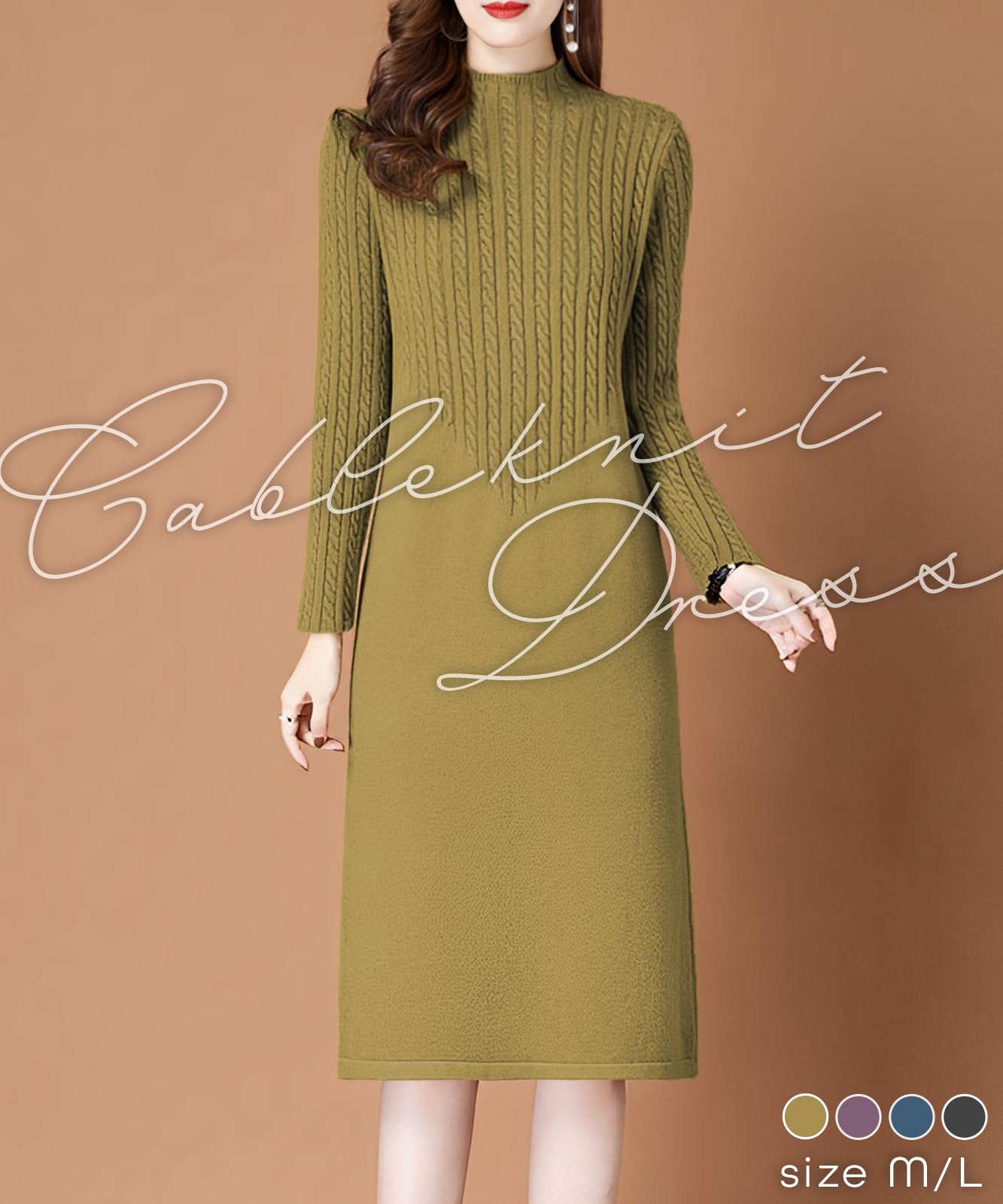 [newNE] 【在庫限り】ニットワンピース ケーブル編み 風 ミディ丈 長袖 無地 シンプル エレガント おしゃれ 通勤 秋冬 レディース