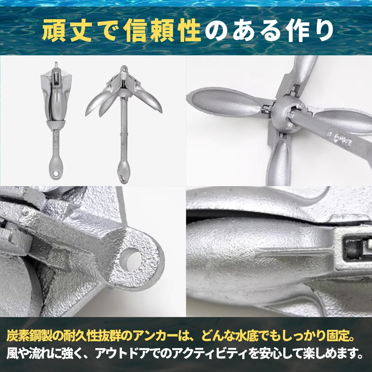 【耐久性に優れた炭素鋼アンカー】 このボートアンカーは頑丈な炭素鋼を使用し、錆びにくい亜鉛錫化処理が施されています。さまざまな環境に耐えうる設計で、長期間安心して使用可能です。