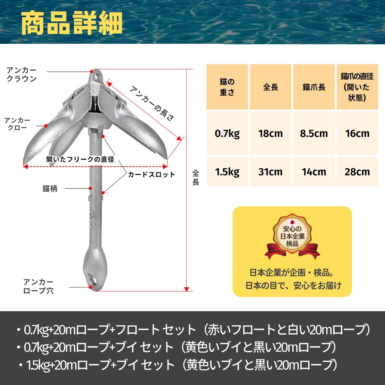 【セット内容】アンカーサイズ:重量約0.7kg〜からお選びいただけます / ロープ:約20m / フロート:約9.5cm×約6.5cm (フロートセットに付属)/ ブイ:約12.5cm×約7cm(ブイセットに付属) / 材質:アンカー:炭素鋼 メッキ製(溶融亜鉛メッキ) / ロープ:ナイロン