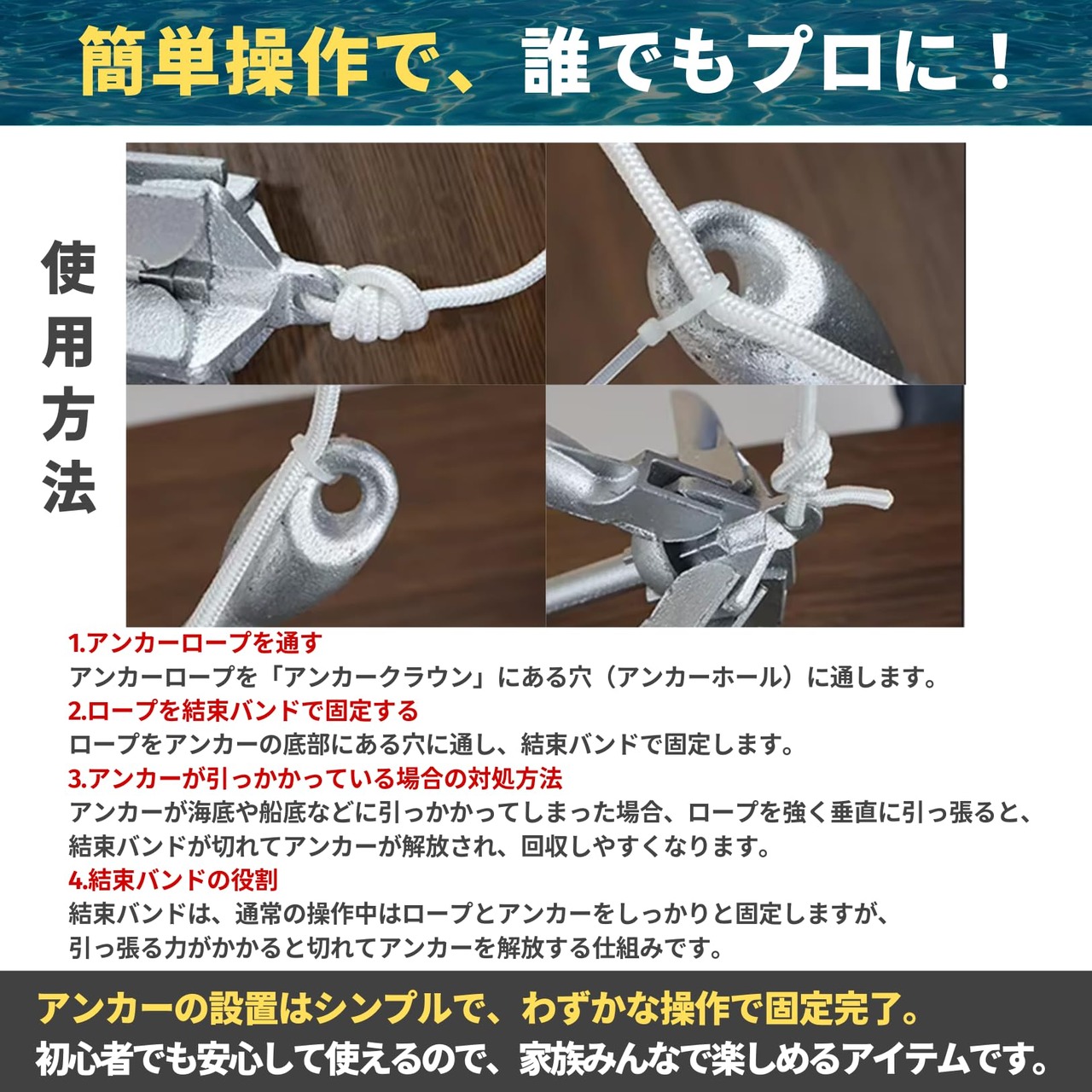 【簡単な操作と持ち運び便利】 アンカーは簡単に組み立てられ、軽量で持ち運びも楽々。折り畳み式で、コンパクトに運べるため、ボート上でもスペースを有効に活用できます。