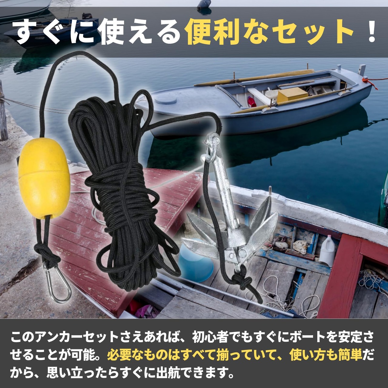 【すぐに使える!オールインワンボートアンカーセット】 このセットには、折り畳みアンカー、20Mの牽引ロープ、フロートもしくはブイボールが含まれ、購入後すぐに使えます。初めてボートアンカーを使う方でも安心で、迷わずセットアップ可能です。